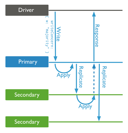 图中是一个一主两从的副本集,设置了w: “majority”,代表一个写操作,需要等待副本集中绝大多数节点(本例中是两个)应用完,才能给客户端反馈。