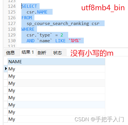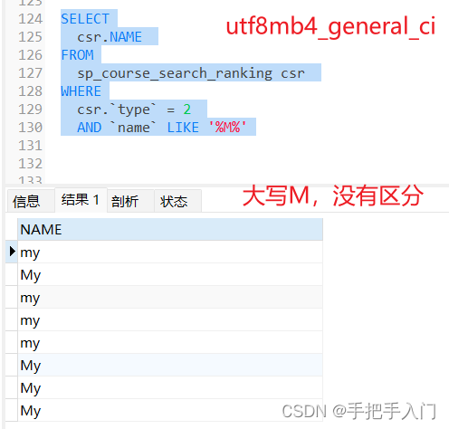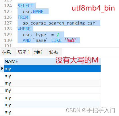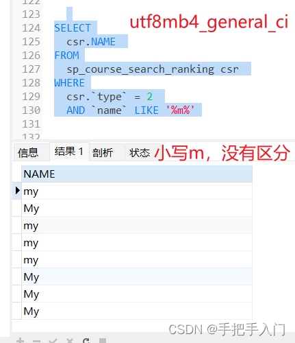答案是:修改该字段的字符集,一般我们创建数据库是会给个默认的 utf8mb4_general_ci 字符集(作用整库、所有字段都会默认这个字符集),如果我们想要区分大小写的话 utf8mb4_general_ci 字符集是无法满足的;所以需要修改这个字段的字符集为 utf8mb4_bin ,然后我们运行以下语句 就可以分别查出大小写不同的数据