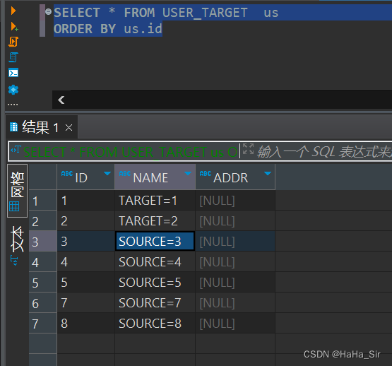 -- 3.2、不存在 ID=7,8 添加数据 MERGE INTO USER_TARGET T1 USING ( SELECT 7 AS ID , 'SOURCE=7' AS NAME FROM DUAL UNION ALL SELECT 8 AS ID , 'SOURCE=8' AS NAME FROM DUAL )T2 ON (T1.ID = T2.ID) WHEN NOT MATCHED THEN INSERT (ID,NAME) VALUES(T2.ID,T2.NAME) ;