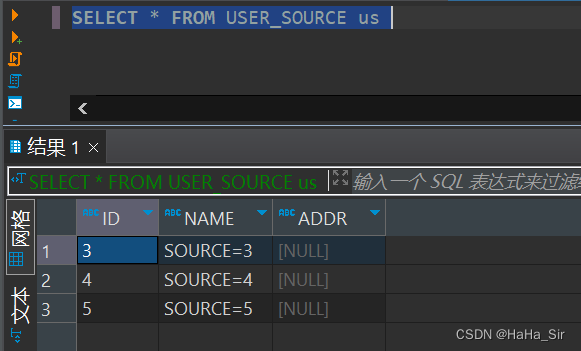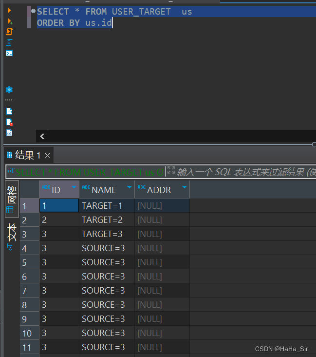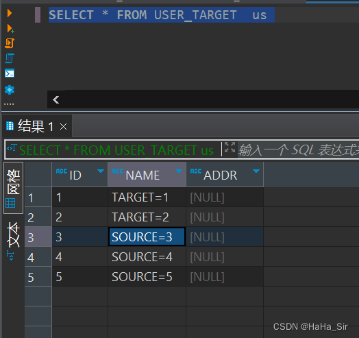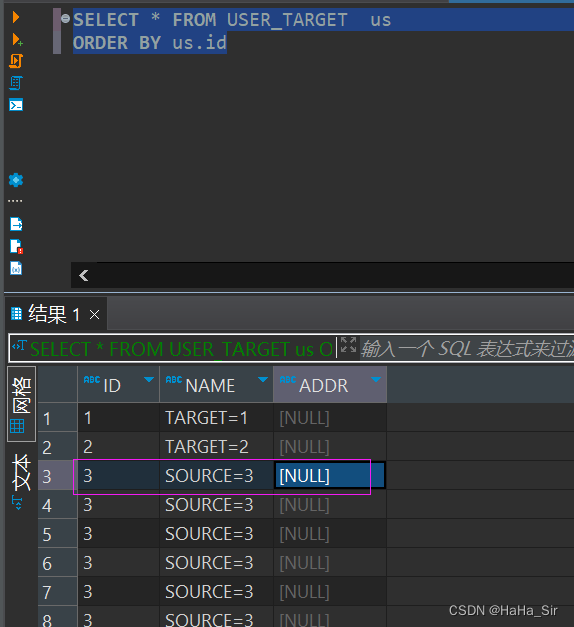 ON (T1.ID = T2.ID AND T1.ADDR = T2.ADDR ) MERGE INTO USER_TARGET T1 USING ( SELECT * FROM USER_SOURCE a WHERE a.id ='3' )T2 -- ON 条件不满足,会执行insert插入数据 ON (T1.ID = T2.ID AND T1.ADDR= T2.ADDR) WHEN MATCHED THEN UPDATE SET T1.NAME = T2.NAME WHEN NOT MATCHED THEN INSERT (ID,NAME) VALUES(T2.ID,T2.NAME) ;