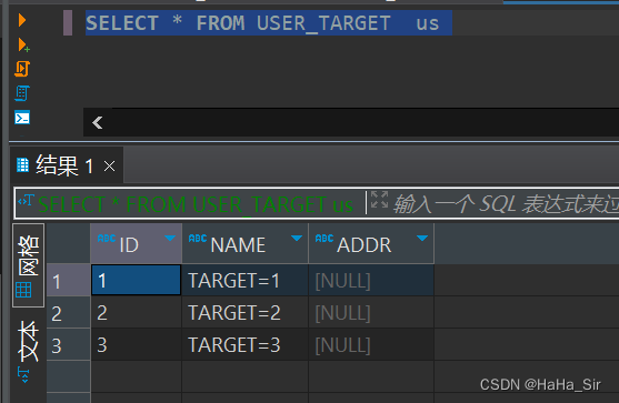 MERGE INTO target_table tt -- 目标表 USING source_table st -- 关联表 ON (tt.id = st.id AND tt.age = st.age ) -- 是否唯一条件,可以是多个 WHEN MATCHED AND tt.name <> st.name THEN -- 1、满足条件--带额外条件 WHEN MATCHED THEN -- 2、满足条件-- 不带额外条件 UPDATE SET -- 执行更新操作,注意没有 表名 update set tt.name = st.name , tt.age = st.age [ WHEN NOT MATCHED THEN ] -- 3、不满足条件, 可选,非必须语句 INSERT (id, name) VALUES (st.id, st.name); -- 执行添加操作,注意没有表名 insert -- WUDI.USER_TARGET definition CREATE TABLE "WUDI"."USER_TARGET" ( "ID" VARCHAR2(100), "NAME" VARCHAR2(100), "ADDR" VARCHAR2(100) ) SEGMENT CREATION IMMEDIATE PCTFREE 10 PCTUSED 40 INITRANS 1 MAXTRANS 255 NOCOMPRESS LOGGING STORAGE(INITIAL 65536 NEXT 1048576 MINEXTENTS 1 MAXEXTENTS 2147483645 PCTINCREASE 0 FREELISTS 1 FREELIST GROUPS 1 BUFFER_POOL DEFAULT FLASH_CACHE DEFAULT CELL_FLASH_CACHE DEFAULT) TABLESPACE "WUDI" ; COMMENT ON COLUMN WUDI.USER_TARGET.ID IS '主键'; COMMENT ON COLUMN WUDI.USER_TARGET.NAME IS '名字'; COMMENT ON COLUMN WUDI.USER_TARGET.ADDR IS '地址'; --- USER_SOURCE 表创建过程略 -- 1.1、 USER_TARGET 初始化数据 ID= 1,2,3 INSERT INTO WUDI.USER_TARGET(ID, NAME, ADDR) VALUES('1', 'TARGET=1', ''); INSERT INTO WUDI.USER_TARGET(ID, NAME, ADDR) VALUES('2', 'TARGET=2', ''); INSERT INTO WUDI.USER_TARGET(ID, NAME, ADDR) VALUES('3', 'TARGET=3', NULL); -- 2.1、 USER_SOURCE 初始化数据 ID= 3,4,5 INSERT INTO WUDI.USER_SOURCE (ID, NAME, ADDR) VALUES('3', 'SOURCE=3', NULL); INSERT INTO WUDI.USER_SOURCE (ID, NAME, ADDR) VALUES('4', 'SOURCE=4', NULL); INSERT INTO WUDI.USER_SOURCE (ID, NAME, ADDR) VALUES('5', 'SOURCE=5', NULL);