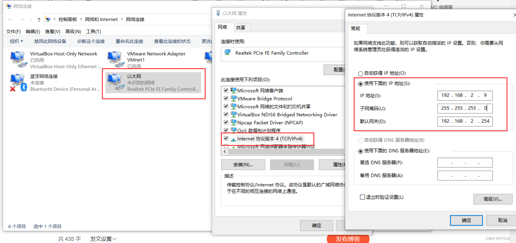 本地电脑选择“设置——网络和Internet——以太网——更改适配器选项——右键单击以太网——属性——IPV4——配置IP地址”