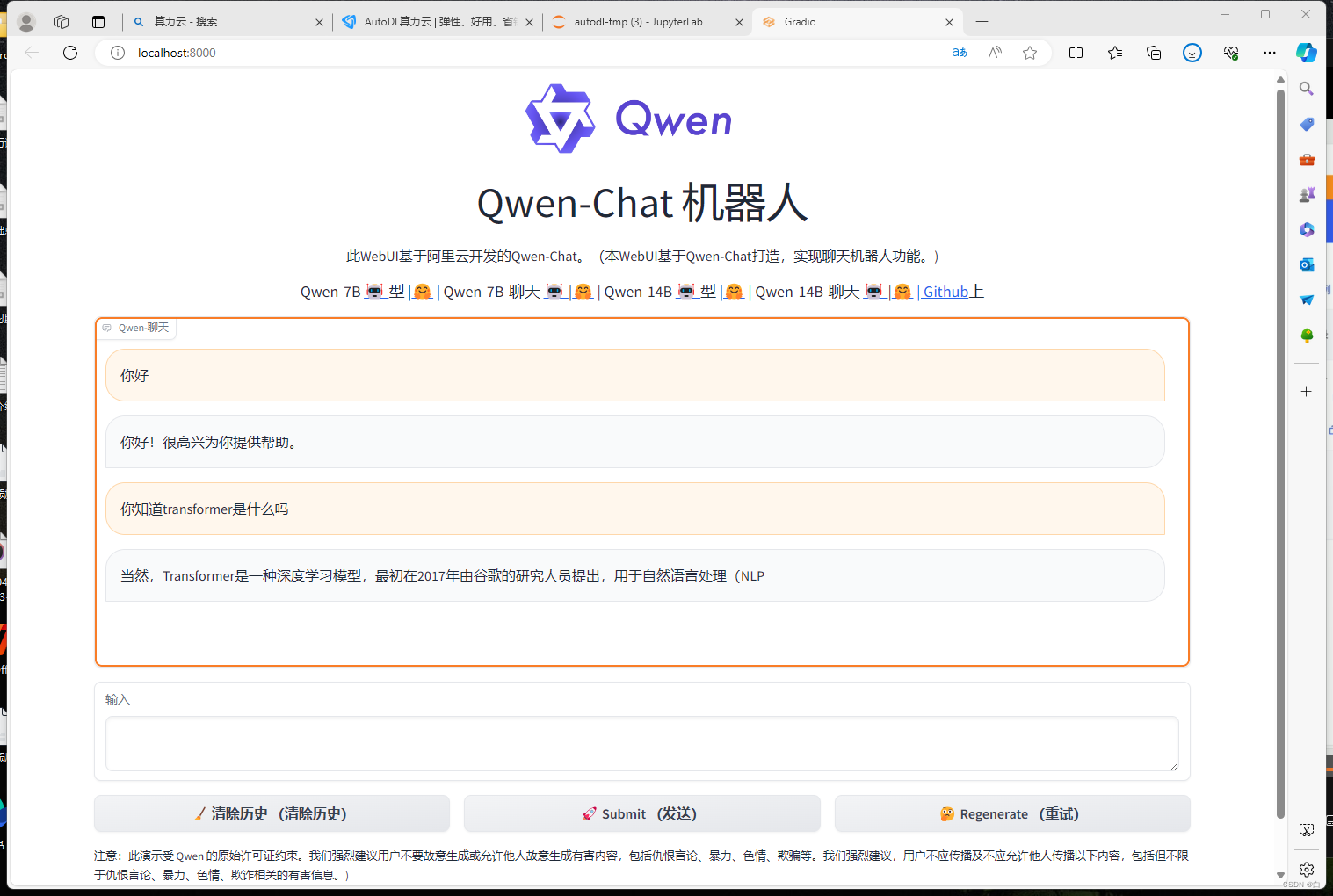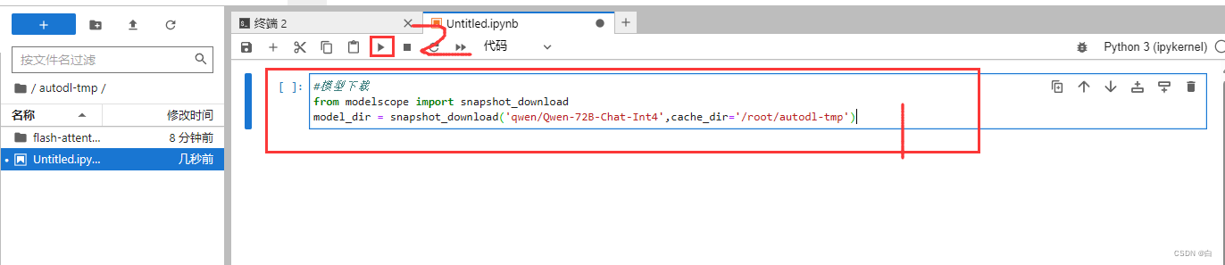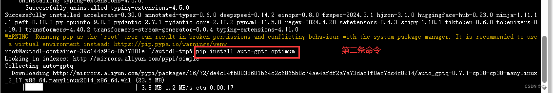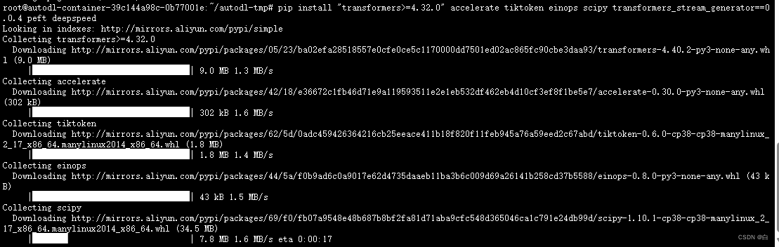 cd /autodl-tmp路径下,不创建环境,直接安包(两条命令)1.pip install "transformers>=4.32.0" accelerate tiktoken einops scipy transformers_stream_generator==0.0.4 peft deepspeed