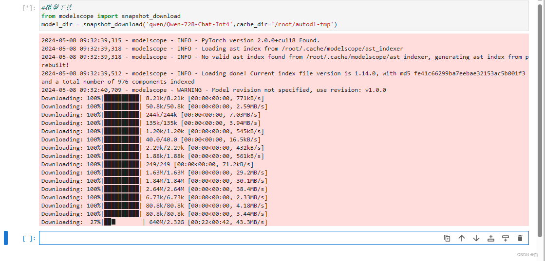 model_dir = snapshot_download('qwen/Qwen-72B-Chat-Int4',cache_dir='/root/autodl-tmp')