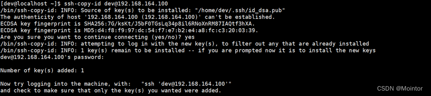 ssh-copy-id dev@192.168.164.100 命令执行后执行如下: