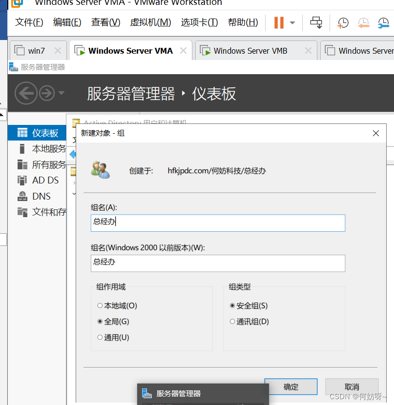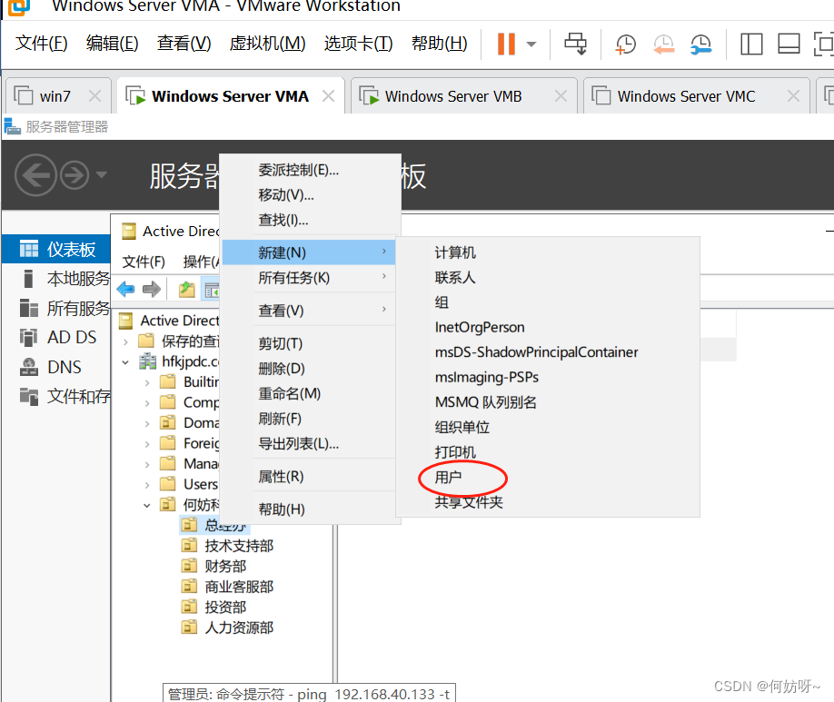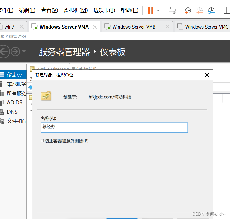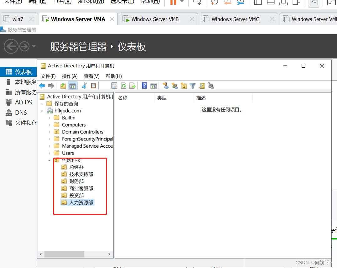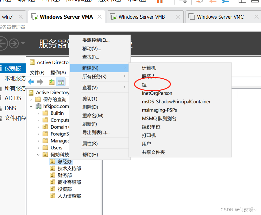 创建OU、用户、用户组(以何妨科技的组织架构为例,总经办、技术支持部、财务部、一部、二部、三部、四部、五部、七部、商业客户部);