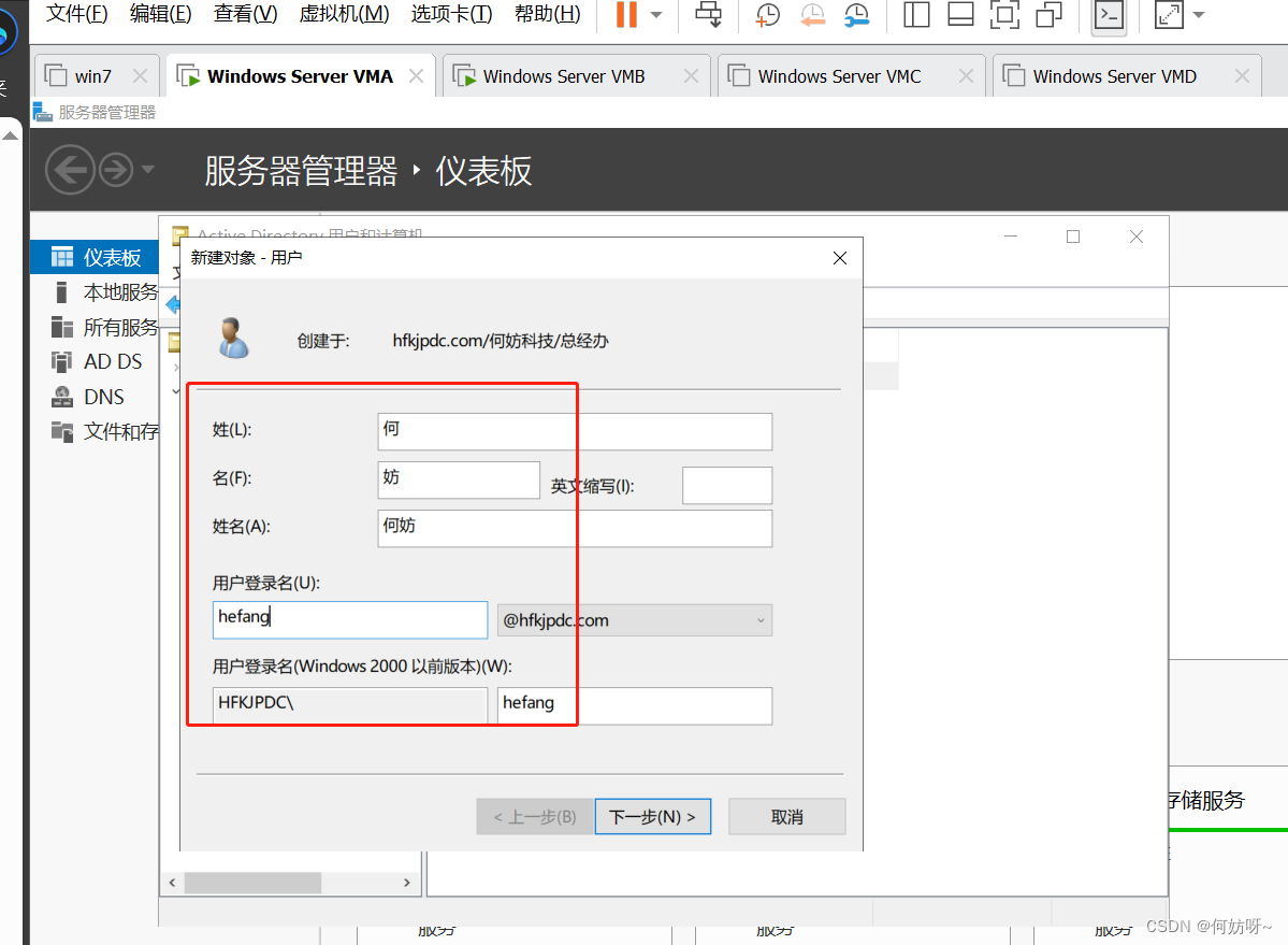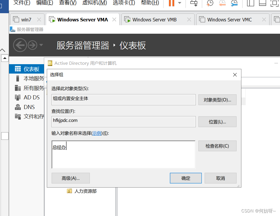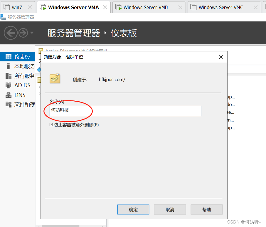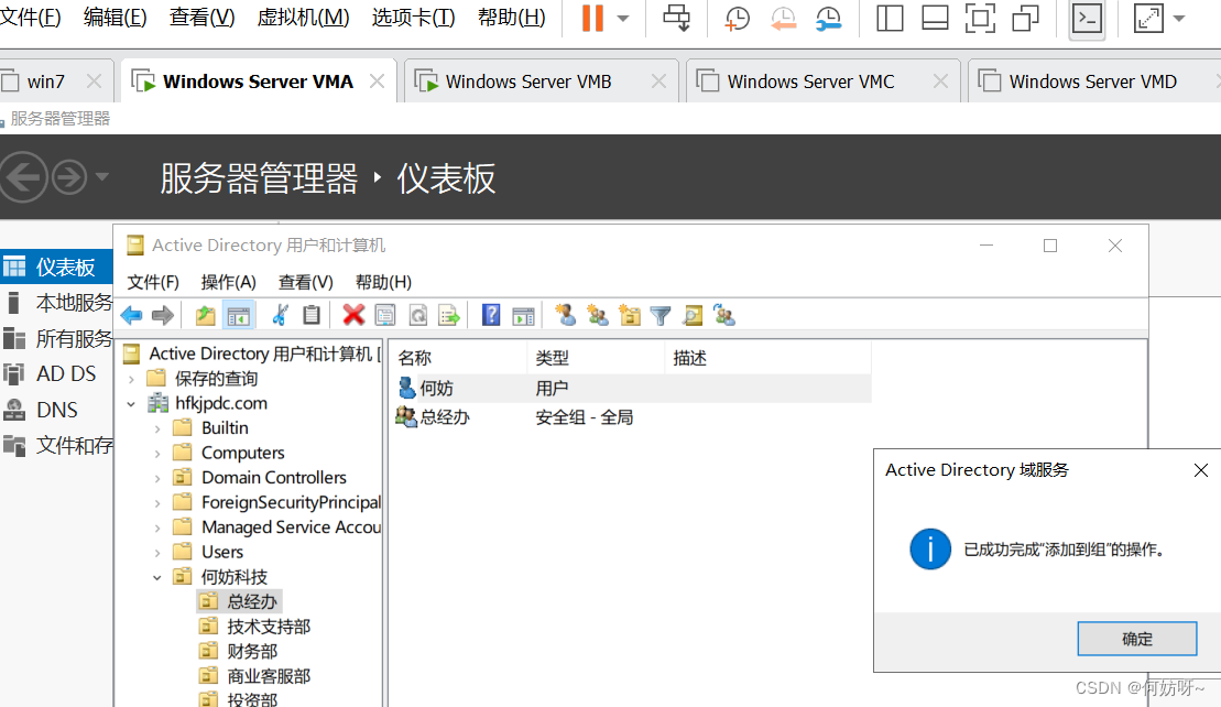 创建OU、用户、用户组(以何妨科技的组织架构为例,总经办、技术支持部、财务部、一部、二部、三部、四部、五部、七部、商业客户部);