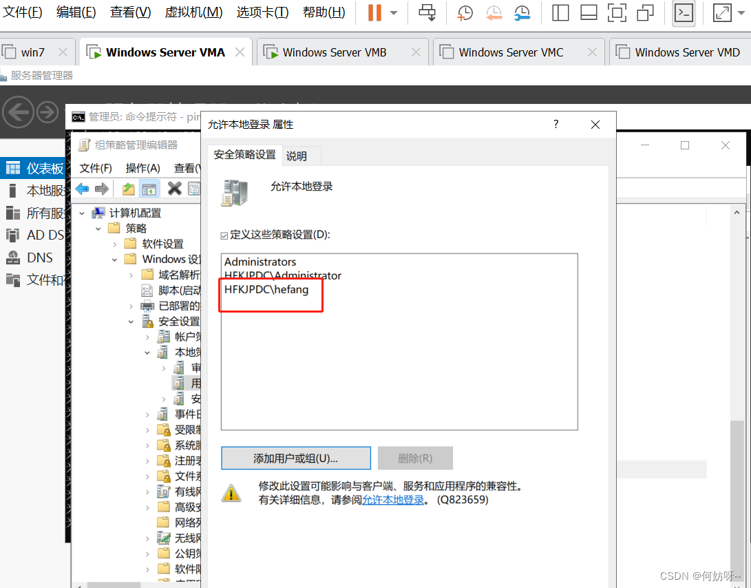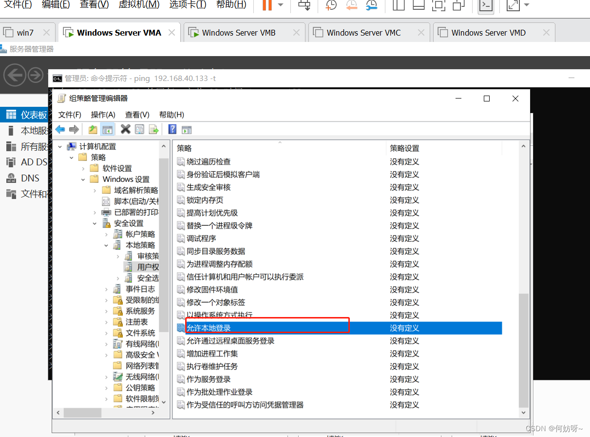 4、计算机配置-策略-windows设置-安全设置-本地策略-用户权限分配-允许本地登录,然后将用户或组加入到列表内