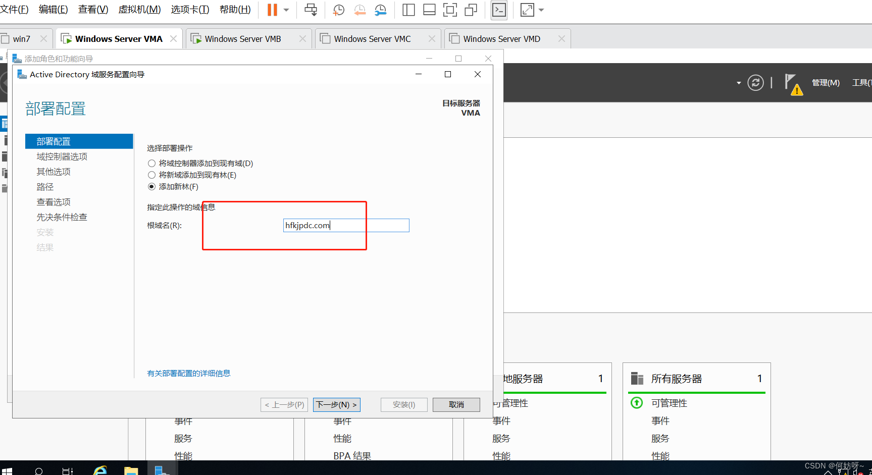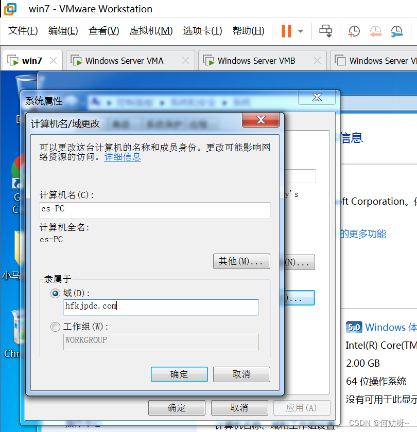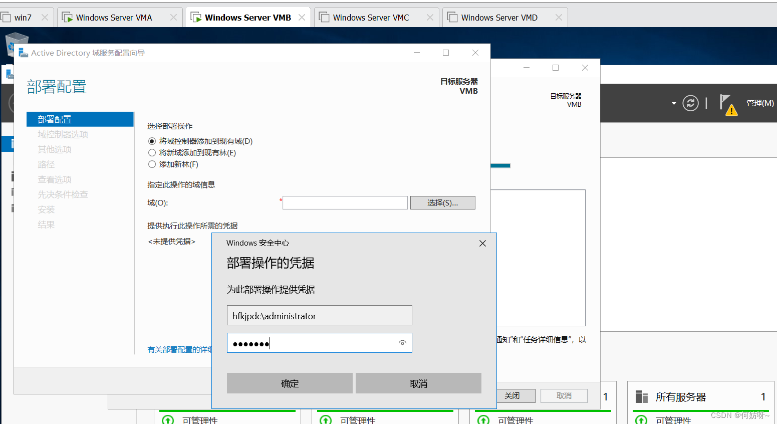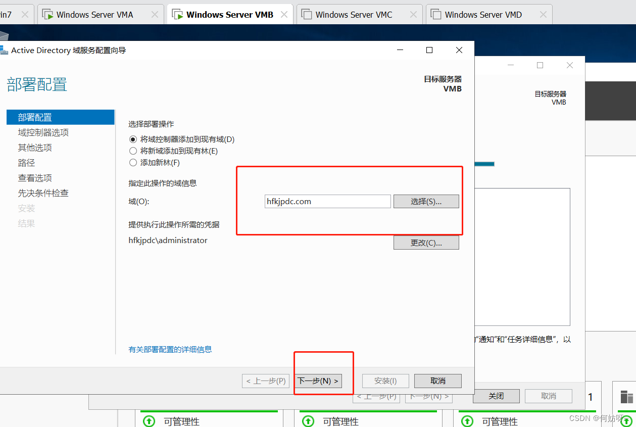 1、将VMB域控添加到现有域,输入域名hfkjpdc.com,并且输入现有权限添加域控的账户hfkjpdc\administrator密码。