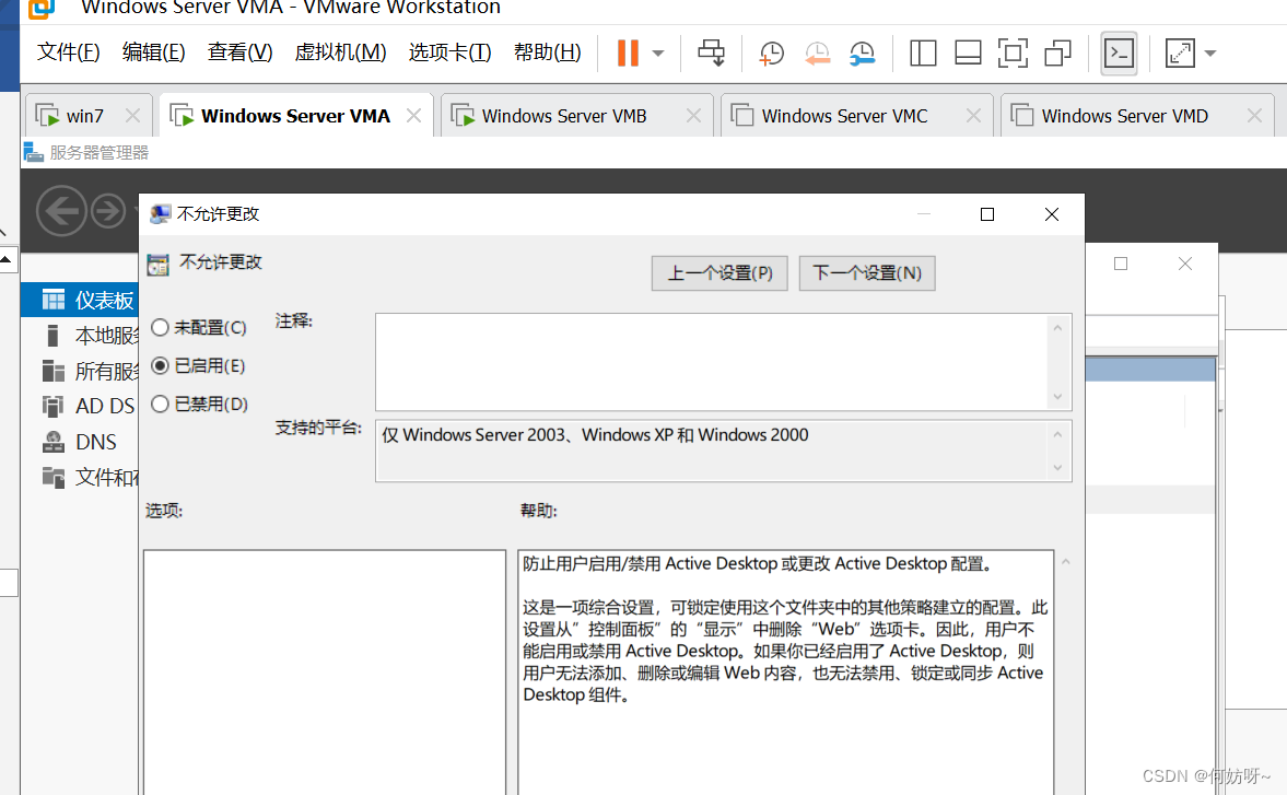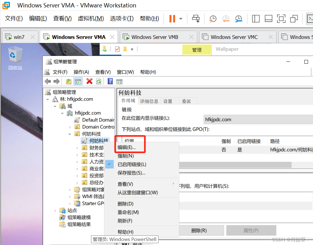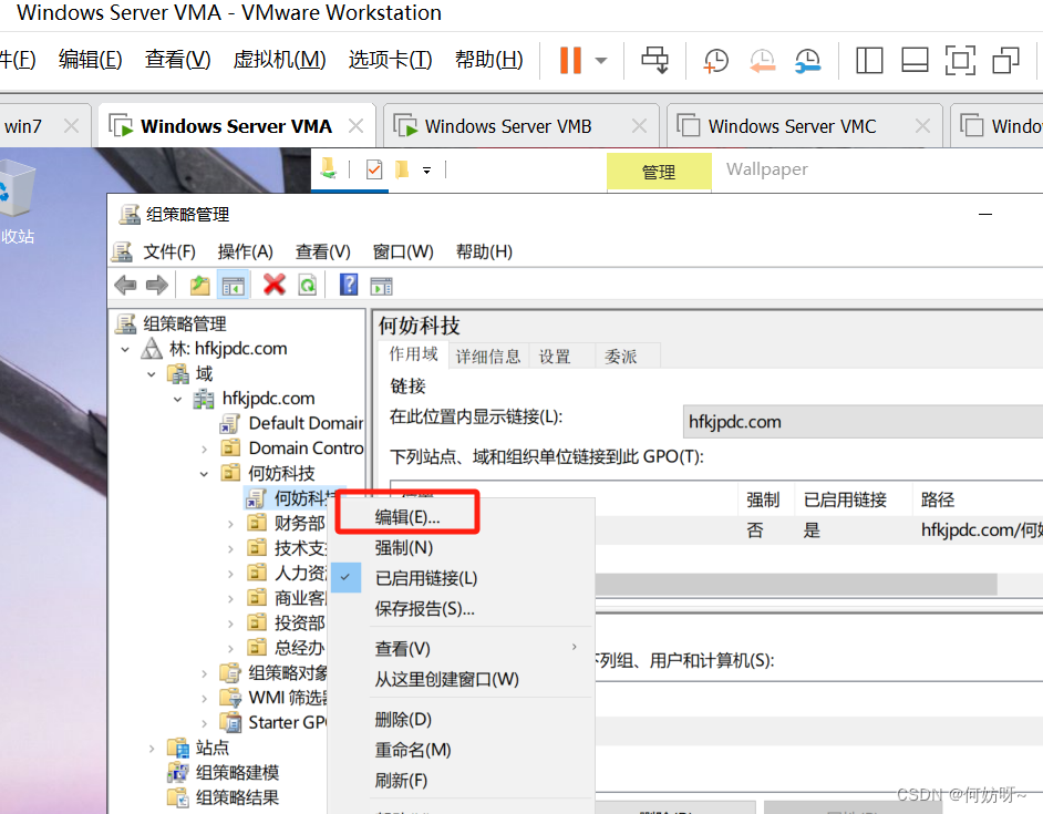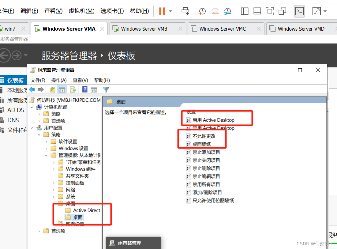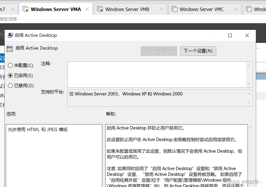 组策略管理(gpmc.msc)→依次展开HFKJPDC.COM→编辑何妨科技GPO→依次展开[用户_策略_管理模板_桌面_Active Desktop]→启用Active Desktop、启用不允许更改、启用桌面墙纸并输入墙纸名称路径;