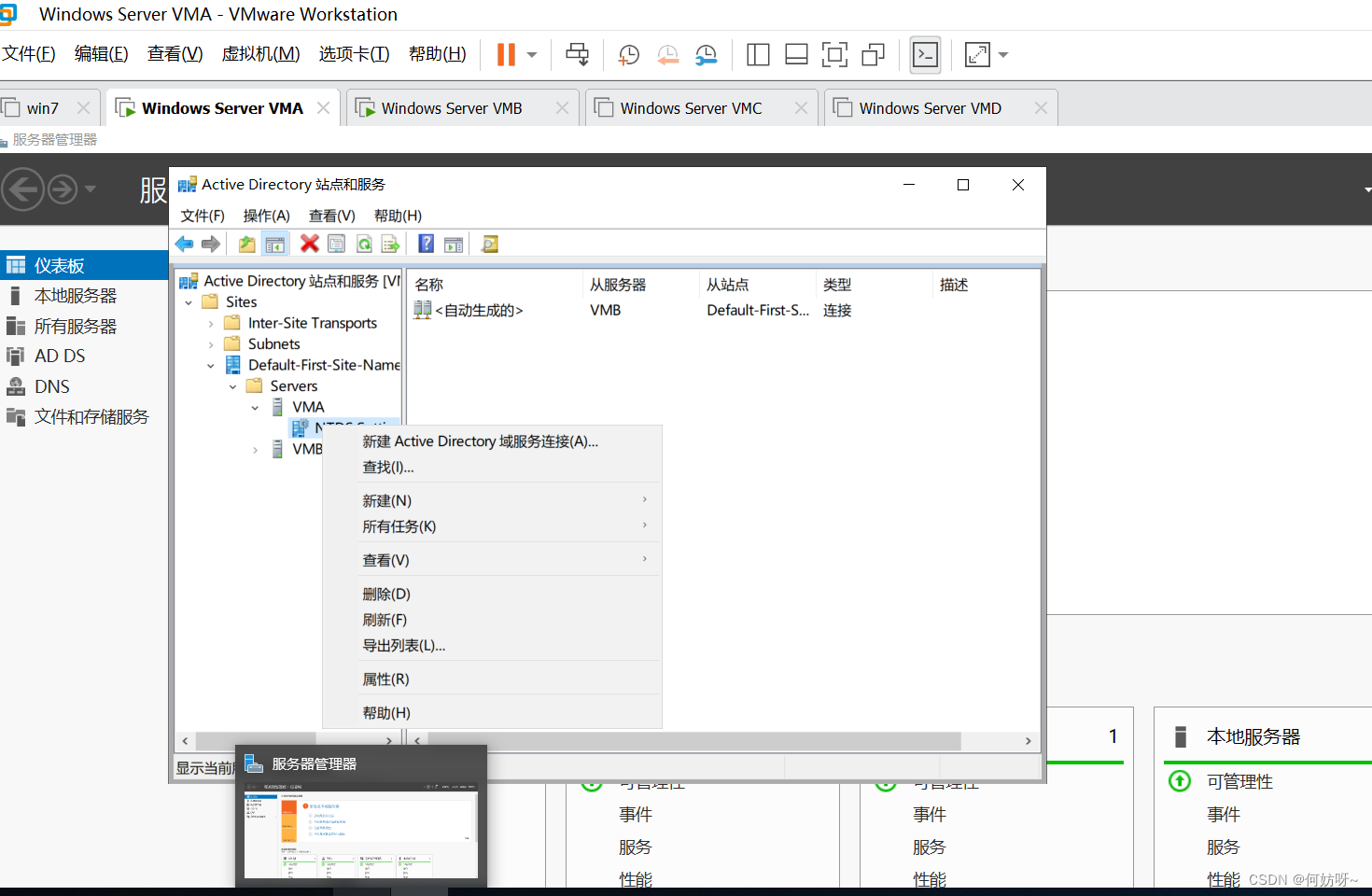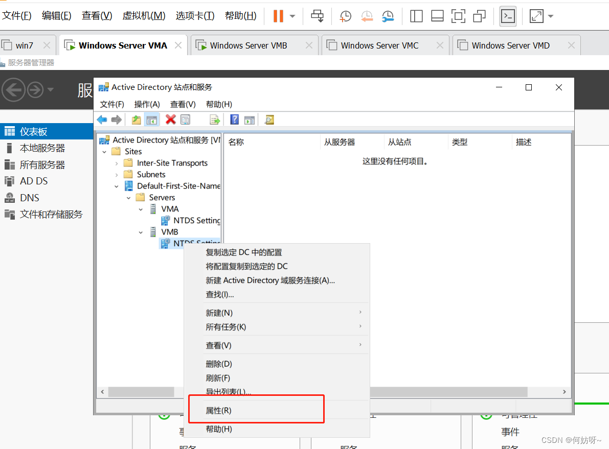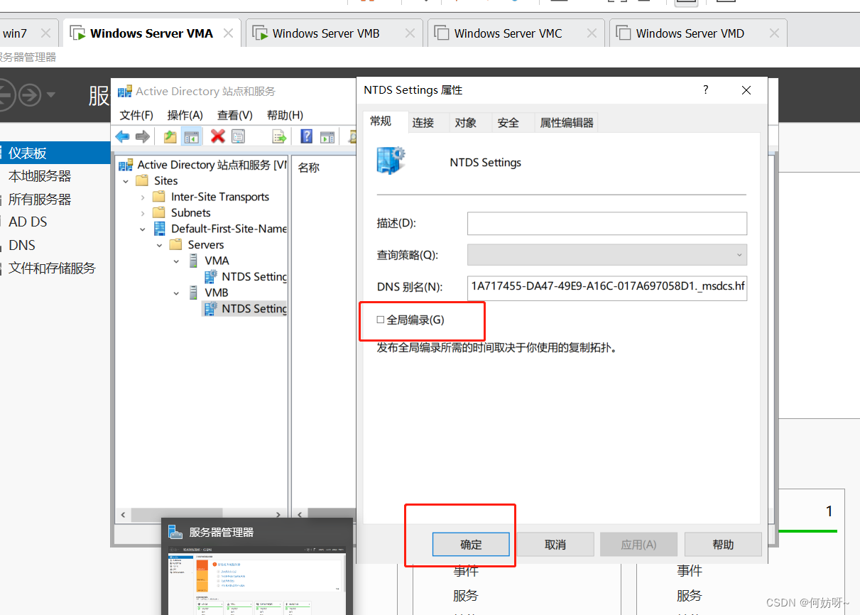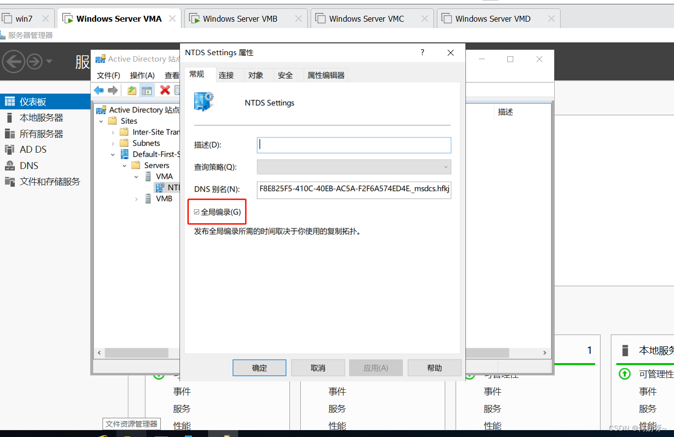 Active Directory站点和服务→Sites→Default-First-Site-Name→Servers→目标控制器→NIDS Settings→右键属性→勾选全局编录→应用;同样操作VMB取消全局编录;