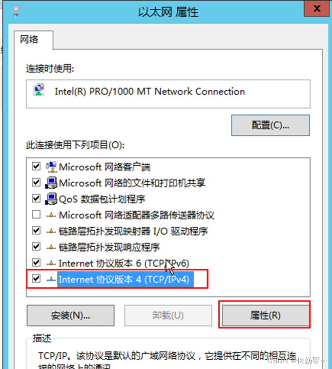 3、选择Internet协议版本4(TCP/IPV4),然后选择属性
