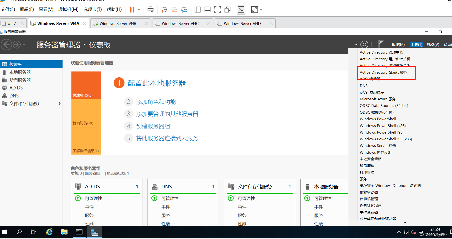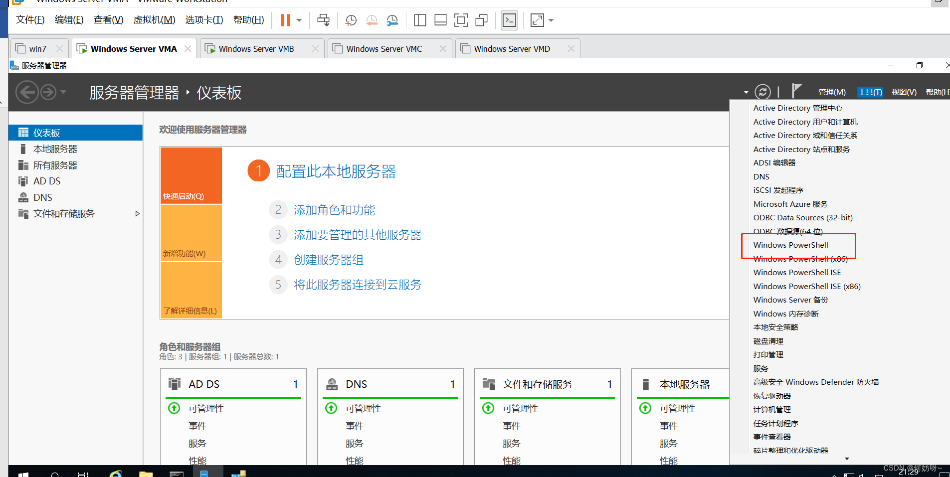 1、根据实验需求,需要创建4台实验(系统为windows2019)云主机VMA、VMB、VMC、VMD和1台测试(系统为win7系统)云主机。