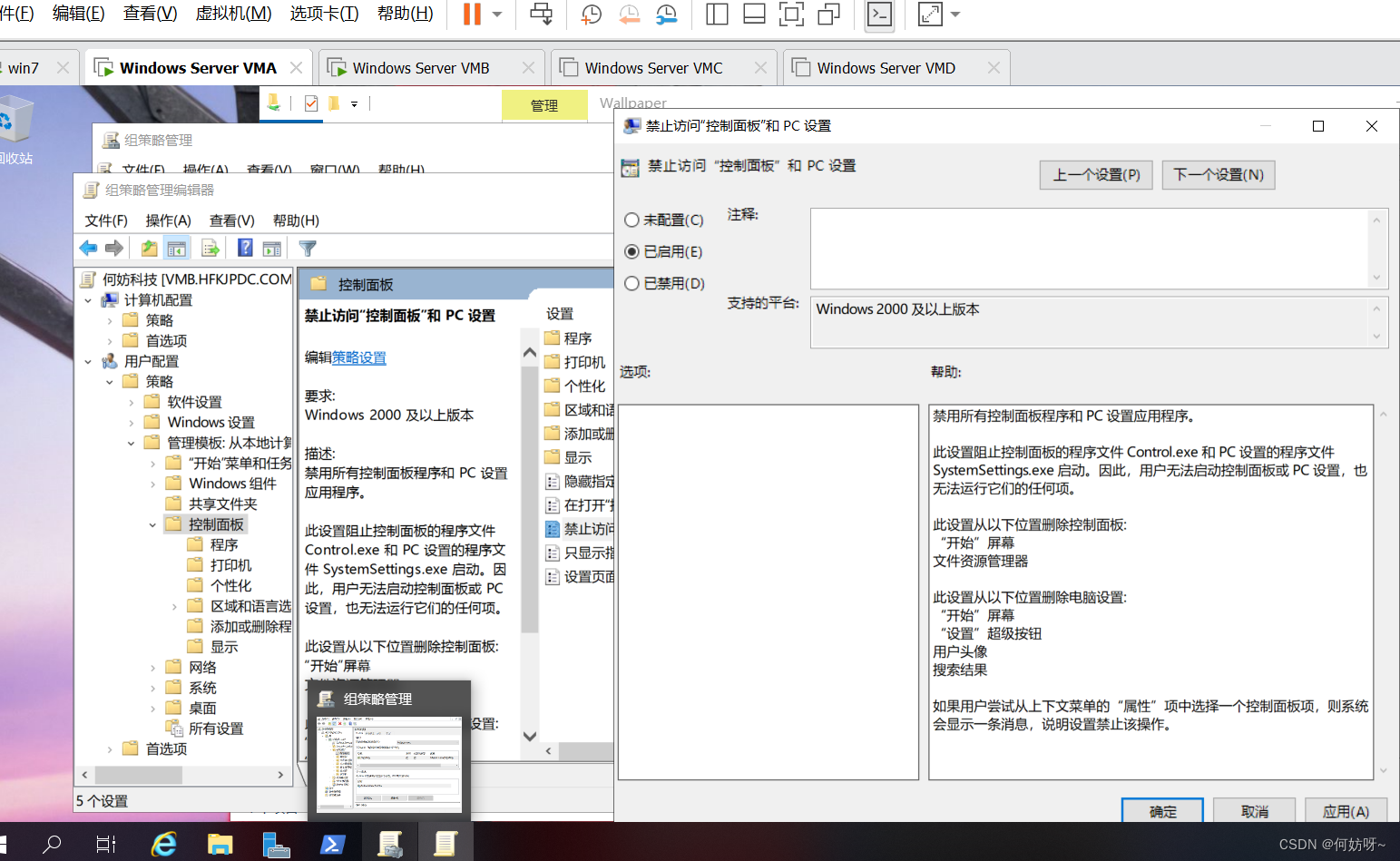 组策略管理(gpmc.msc)→依次展开SZPDC.COM→编辑神州动力GPO→依次展开[用户_策略_管理模板_控制面板]→启用禁止访问“控制面板”和PC设置;