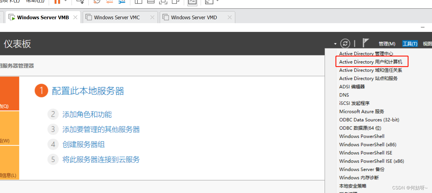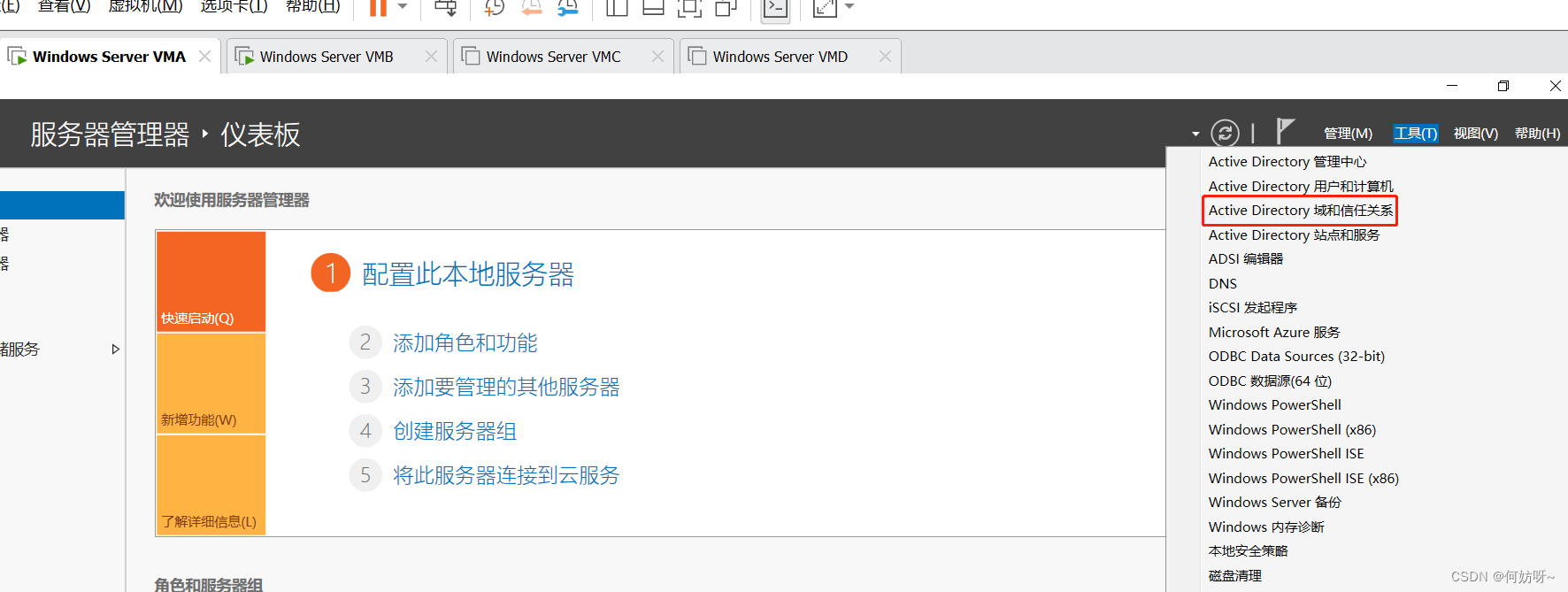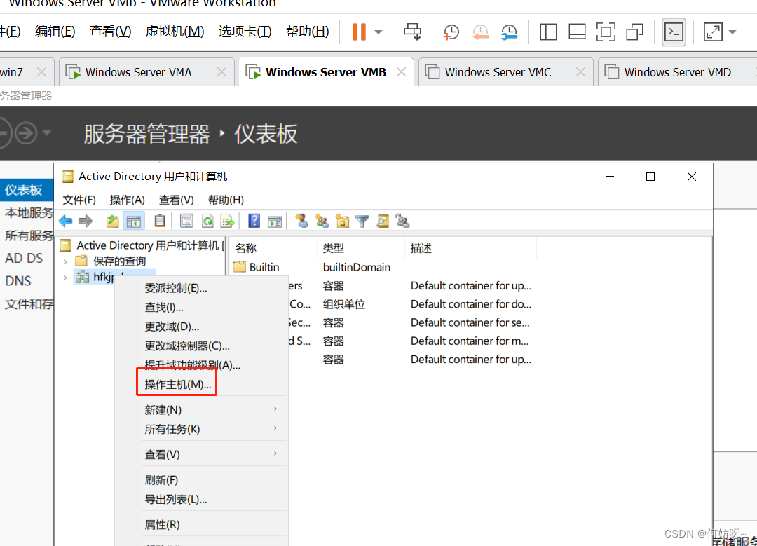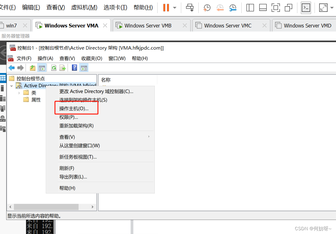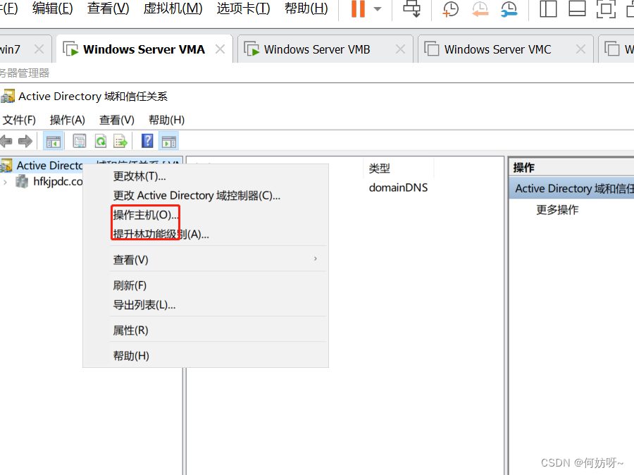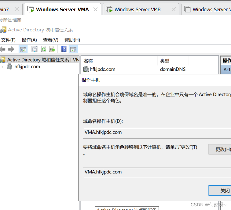 Active Directory域和信任关系→右键Active Directory域和信任关系→操作主机→域命名主机为VMA,不需要更改;