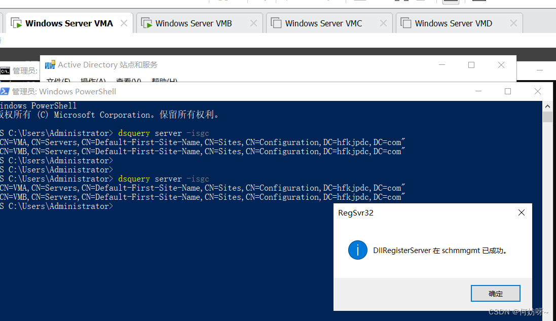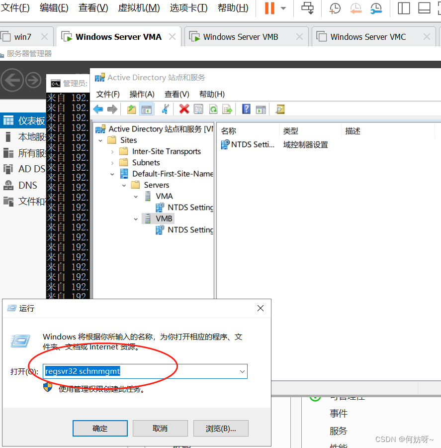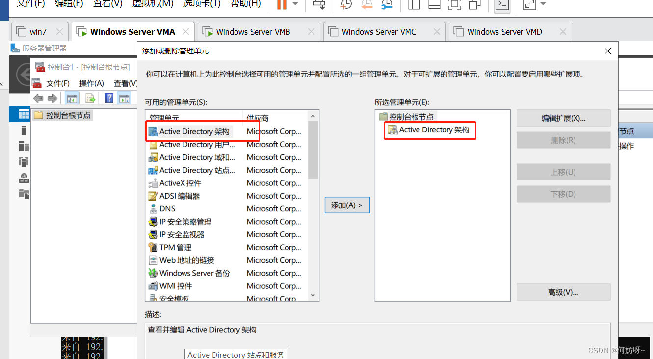 运行→regsvr32 schmmgmt→确定→运行→MMC→文件→添加删除管理单元→添加Active Directory架构→确定→右键Active Directory架构→操作主机→架构主机为VMA,不需要更改;