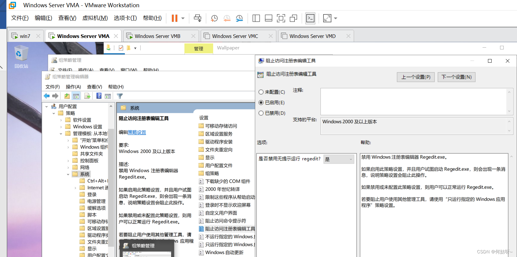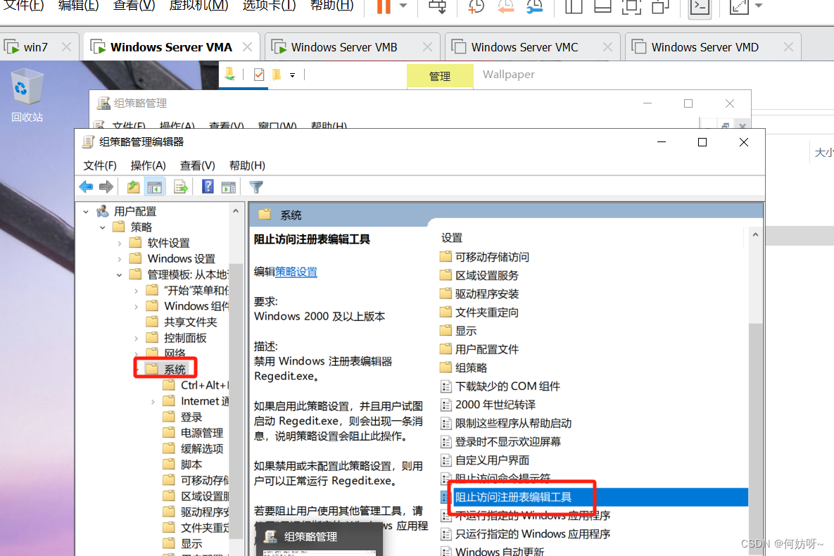 组策略管理(gpmc.msc)→依次展开HFKJPDC.COM→编辑神州动力GPO→依次展开[用户_策略_管理模板_系统]→启用阻止访问注册表编辑工具;