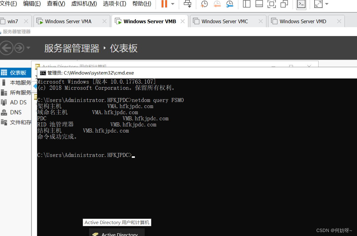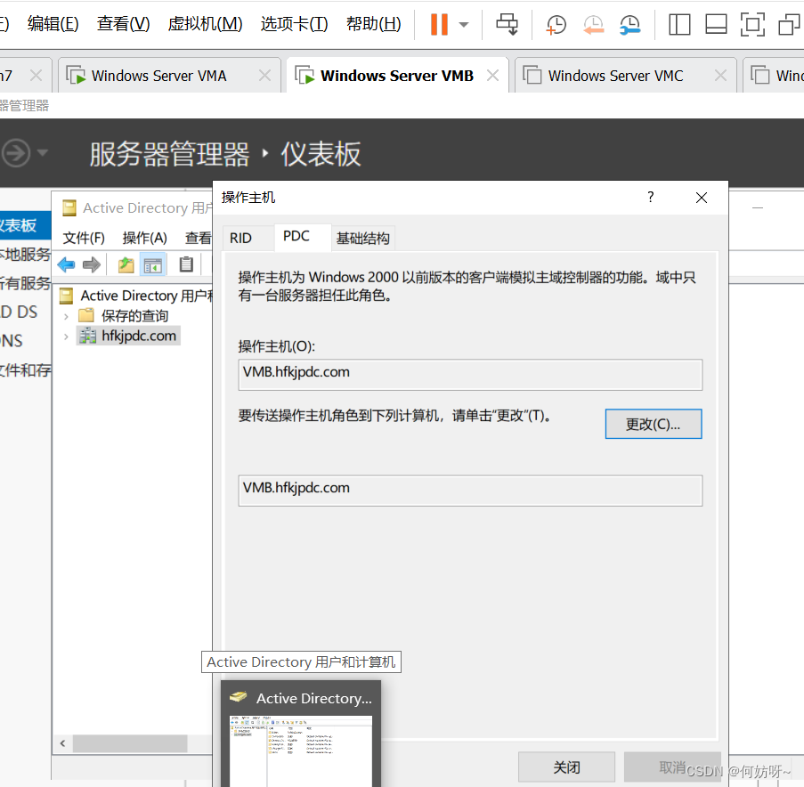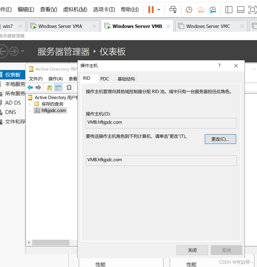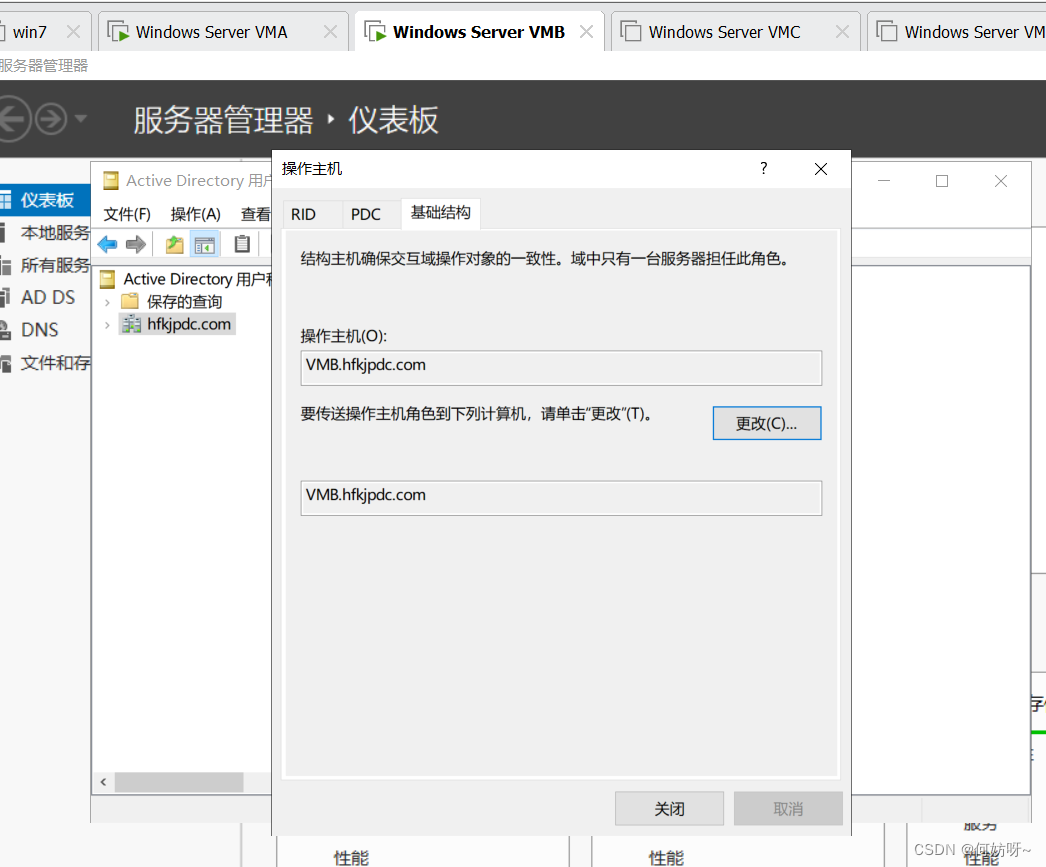 Active Directory用户和计算机→右键hfkjpdc.COM→操作主机→在RID、PDC、基础结构中可以分别更改RID、PDC、Infrastructure Master;