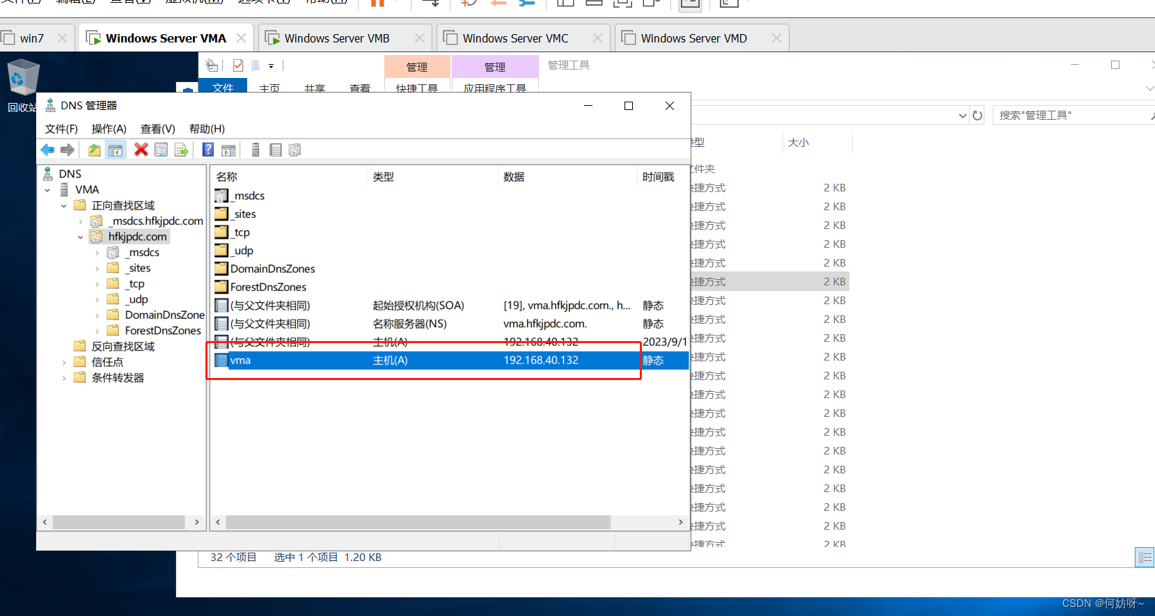 2、默认会有一个hfkjpdc.com的区域,主机记录表示域控vma.hfkjpdc.com已经正确的将其主机名与IP地址注册到DNS服务器内。