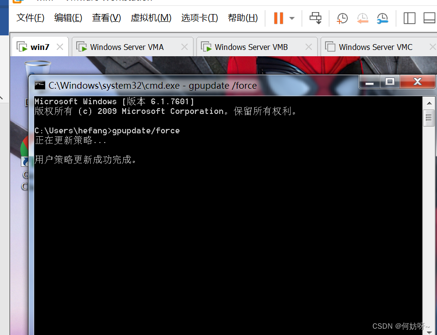 输入 gpupdate/force 命令来立刻刷新组策略,使策略生效,有时候命令刷新不成功,建议注销用户重新登录。