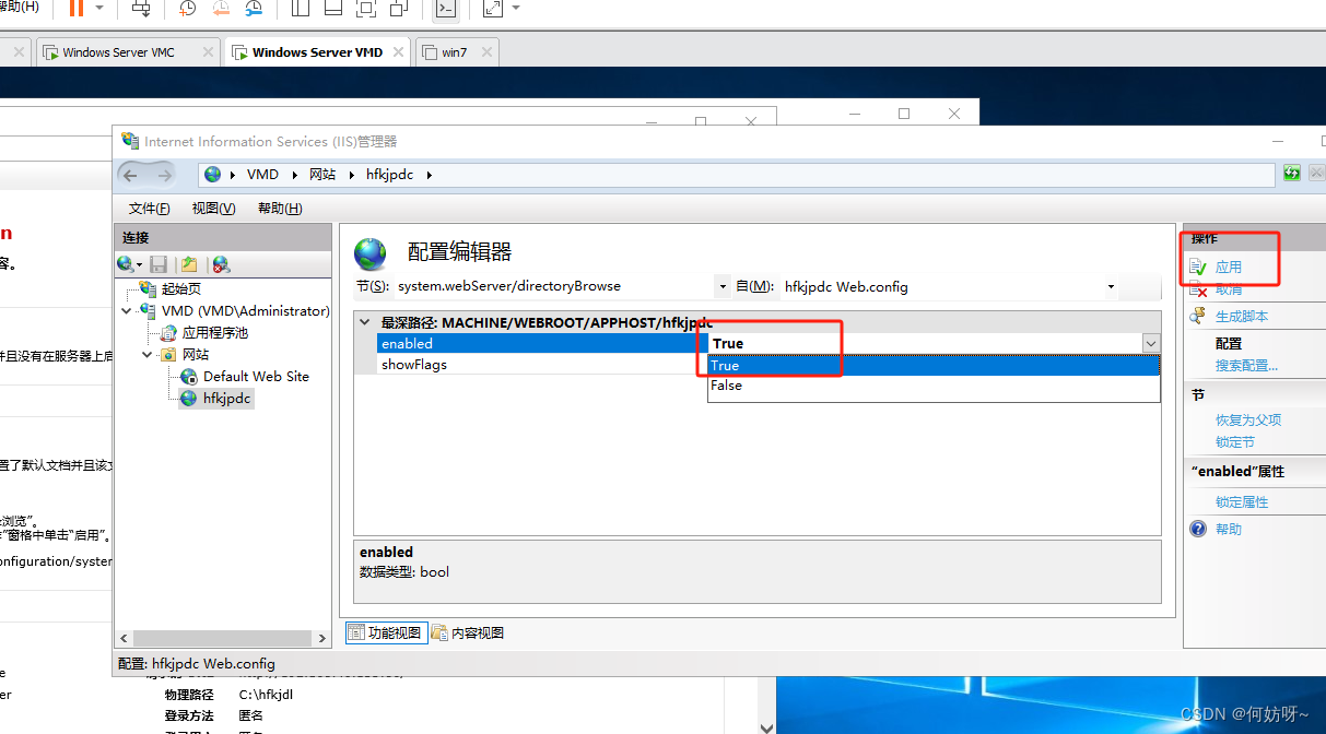 9、在节中找到system.webServer/directoryBrowse,将其中的enabled取值改为True,点击应用!