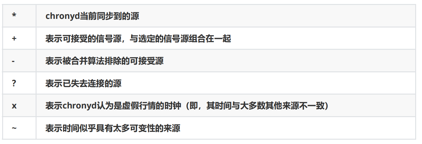 [root@server ~]# chronyc sources -v # -v参数表示显示内容是否有解释 .-- Source mode '^' = server, '=' = peer, '#' = local clock. / .- Source state '*' = current best, '+' = combined, '-' = not combined, | / 'x' = may be in error, '~' = too variable, '?' = unusable. || .- xxxx [ yyyy ] +/- zzzz || Reachability register (octal) -. | xxxx = adjusted offset, || Log2(Polling interval) --. | | yyyy = measured offset, || \ | | zzzz = estimated error. || | | \ MS Name/IP address Stratum Poll Reach LastRx Last sample ====================================================================== (1)M:这表示信号源的模式。^表示服务器,=表示对等方,#表示本地连接的参考时钟。