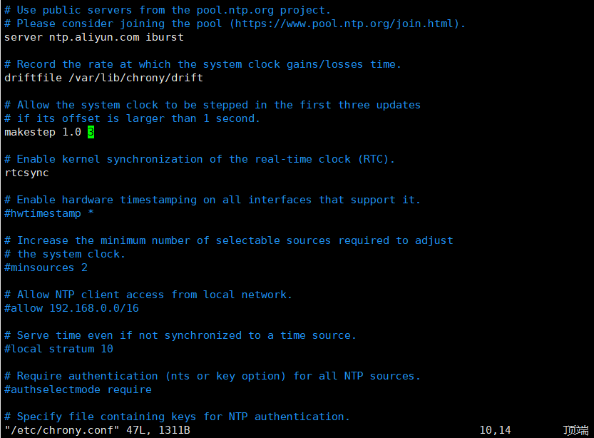 [root@server ~]# vim /etc/chrony.conf # 使用 pool.ntp.org 项目中的公共服务器。 # 或者使用server开头的服务器,理论上想添加多少时间服务器都可以 # iburst表示的是首次同步的时候快速同步 pool pool.ntp.org iburst # 根据实际时间计算出服务器增减时间的比率,然后记录到一个文件中,在系统重启后为系统做出最佳时间 补偿调整。 driftfile /var/lib/chrony/drift # 如果系统时钟的偏移量大于1秒,则允许系统时钟在前三次更新中步进。 # Allow the system clock to be stepped in the first three updates if its offset is larger than 1 second. makestep 1.0 3 # 启用实时时钟(RTC)的内核同步。 # Enable kernel synchronization of the real-time clock (RTC). rtcsync # 通过使用 hwtimestamp 指令启用硬件时间戳 # Enable hardware timestamping on all interfaces that support it. #hwtimestamp * # Increase the minimum number of selectable sources required to adjust the systemclock. #minsources 2 # 指定 NTP 客户端地址,以允许或拒绝连接到扮演时钟服务器的机器 # Allow NTP client access from local network. #allow 192.168.48.0/24 # Serve time even if not synchronized to a time source. # local stratum 10 # 指定包含 NTP 身份验证密钥的文件。 # Specify file containing keys for NTP authentication. # keyfile /etc/chrony.keys # 指定日志文件的目录。 # Specify directory for log files. logdir /var/log/chrony # 选择日志文件要记录的信息。 # Select which information is logged. # log measurements statistics tracking 210.72.145.44 国家授时中心 ntp.aliyun.com 阿里云 s1a.time.edu.cn 北京邮电大学 s1b.time.edu.cn 清华大学 s1c.time.edu.cn 北京大学 s1d.time.edu.cn 东南大学 s1e.time.edu.cn 清华大学 s2a.time.edu.cn 清华大学 s2b.time.edu.cn 清华大学 s2c.time.edu.cn 北京邮电大学 s2d.time.edu.cn 西南地区网络中心 s2e.time.edu.cn 西北地区网络中心 s2f.time.edu.cn 东北地区网络中心 s2g.time.edu.cn 华东南地区网络中心 s2h.time.edu.cn 四川大学网络管理中心 s2j.time.edu.cn 大连理工大学网络中心 s2k.time.edu.cn CERNET桂林主节点 s2m.time.edu.cn 北京大学 ntp.sjtu.edu.cn 202.120.2.101 上海交通大学 同步时间