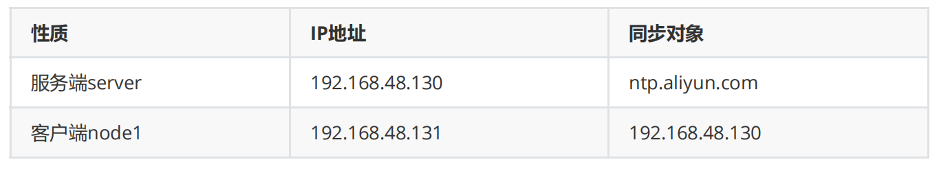 # 安装软件 [root@server ~]# yum install chrony -y # 默认已安装 # 编辑配置文件,定位第3行,修改为阿里的时间服务地址 [root@server ~]# vim /etc/chrony.conf server ntp.aliyun.com iburst # 重启服务 [root@server ~]# systemctl restart chronyd # 测试 [root@server ~]# chronyc sources -v [root@server ~]# timedatectl status # 设置允许客户端时间同步 [root@server ~]# vim /etc/chrony.conf 26 allow 192.168.48.131/24 # 定位第26行,设置谁可以访问本机进行同步 [root@server ~]# systemctl restart chronyd 第二步:定位客户端node1