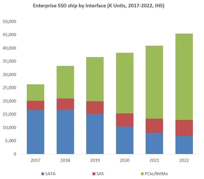 从目前的市场发展来看,SATA接口衰减迅速,SAS市场份额平稳,而PCIe SSD因其更高带宽的优势增长迅速将逐步取代SATA成主流趋势。
