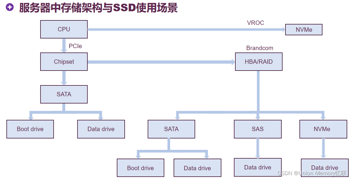 如图所示,我们可以发现在CPU直连SSD这类景下,只要Chipset支持SAS协议即可使用SAS或SATA SSD,若Chipset仅支持SATA协议,此种场景下仅能使用SATA SSD。而另一种场景是通过HBA/Raid卡方式扩展连接SSD,则SAS、 SATA、NVMe均可以使用。以上两种场景主要取决于业务对性能和成本的诉求。