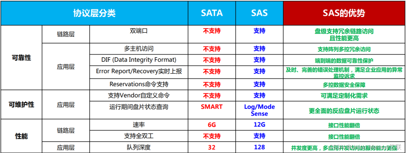 SAS是从企业级应用的SCSI协议演变而来,面向企业级场景应用;而SATA是从消费级应用的ATA协议演变而来,设计及实现相对简单。下从协议层对比来看SATA与SAS的差异,以及SAS所具备的优势: