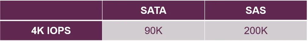 因SAS的协议接口速度比SATA高很多。SAS是一个完全的双向系统,而SATA 则继承了IDE的特性,是半双向通信的系统。因此,SAS系统的吞吐量可以是SATA系统两倍。SATA SSD读写性能一般在500MB/s左右,而SAS SSD性能可达1GB/s,具备双端口的SAS SSD性能可达2GB/s。在4KB数据随机写性能上,SAS也比SATA更有优势: