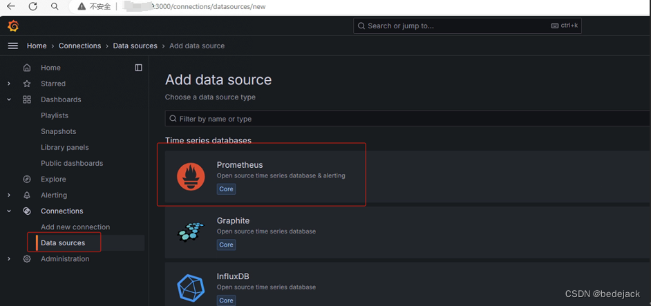 首先需要增加数据源。选择prometheus