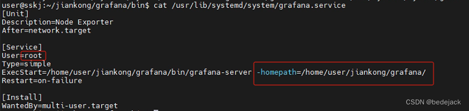 这里注意,首先需要指定root用户启动,否则需要修改grafana配置文件修改全部存储路径和工作空间。之后注意设置启动服务是grafana-server不是grafana,另外指定服务目录。