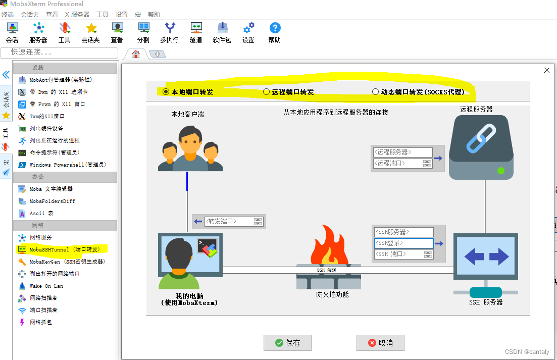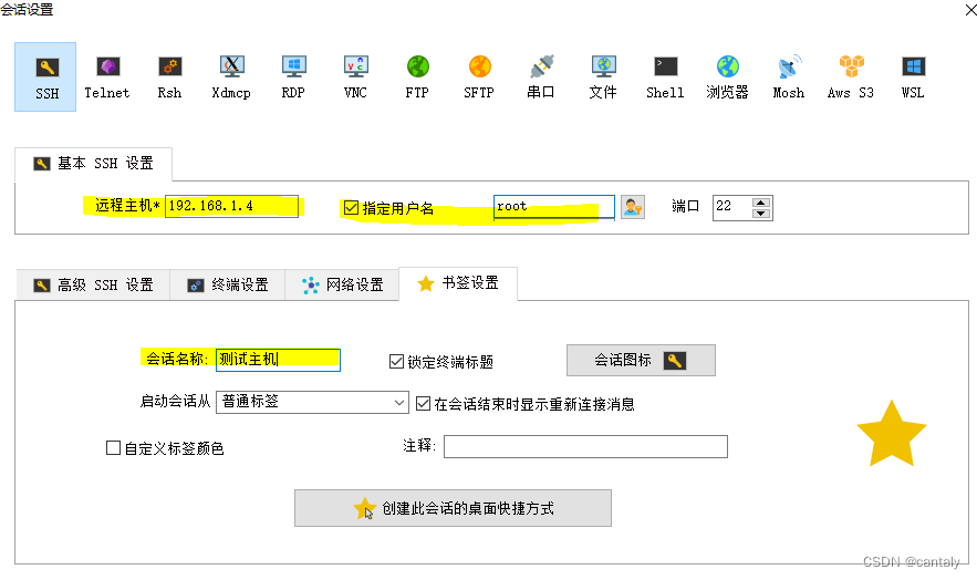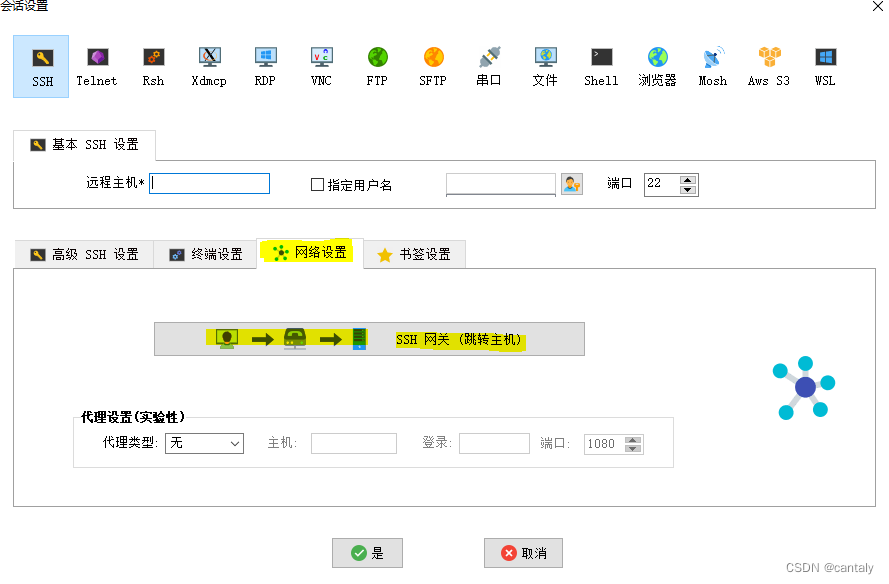 在 ssh, telnet, RDP, VNC 会话中,您可以选择一个“ssh -gateway”(又称“ssh -gateway”)。“跳转主机”),以便告诉MobaXterm首先连接到SSH服务器,然后再连接到您最终想要到达的端服务器。这允许您访问防火墙后的一些服务器,并保护您的连接。