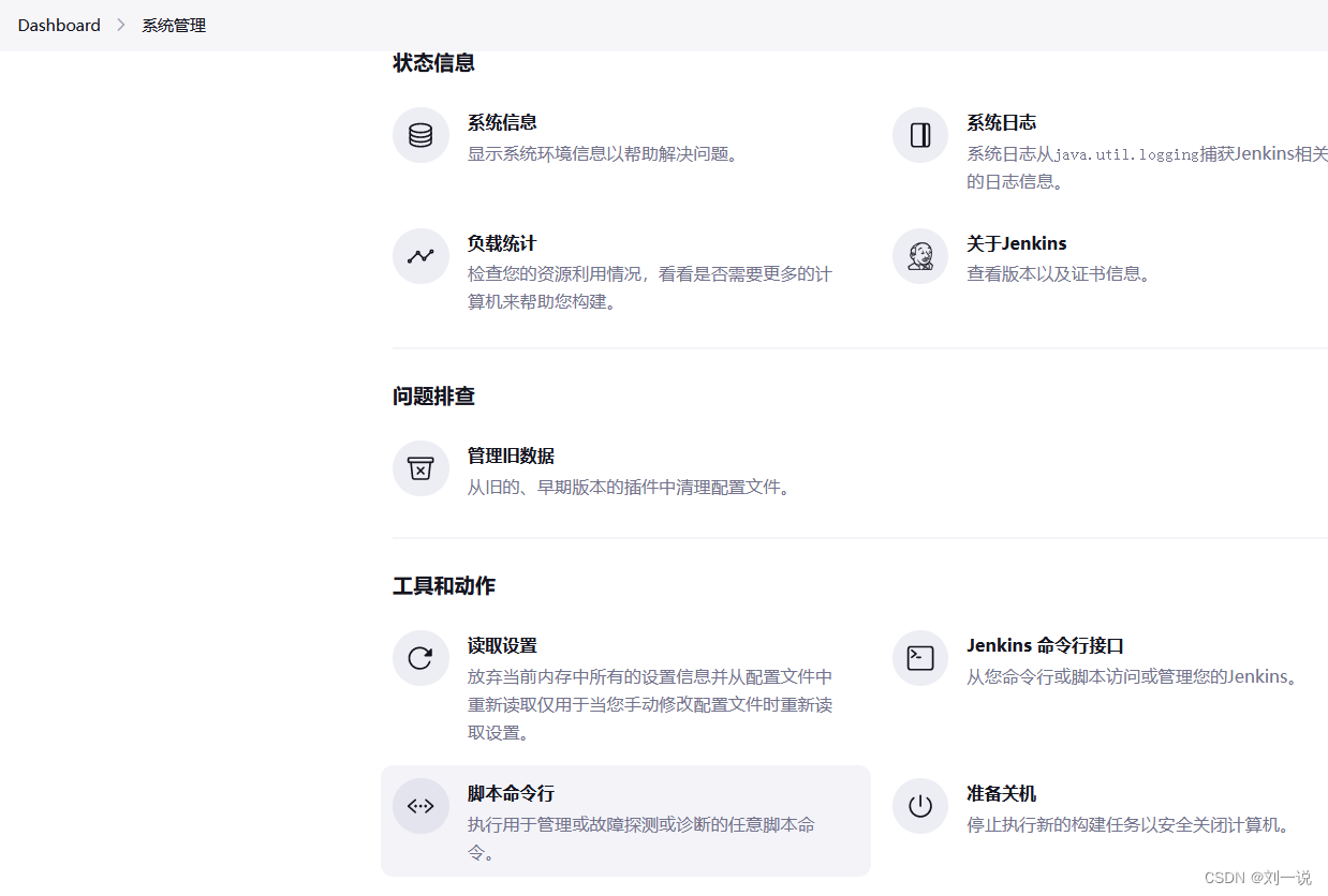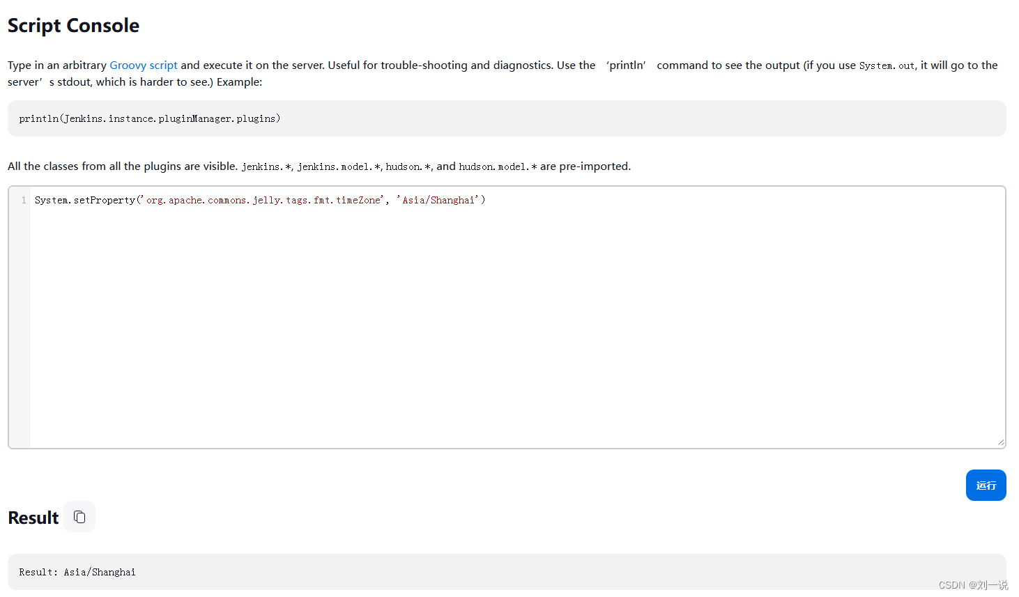 rm -rf /etc/localtime ln -s /usr/share/zoneinfo/Asia/Shanghai /etc/localtime 打开jenkins的【系统管理】---> 【脚本命令行】,在命令框中输入一下命令【时间时区设为 亚洲上海】,如下图: