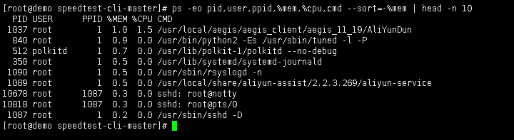 ps -eo pid,user,ppid,%mem,%cpu,cmd --sort=-%mem | head -10