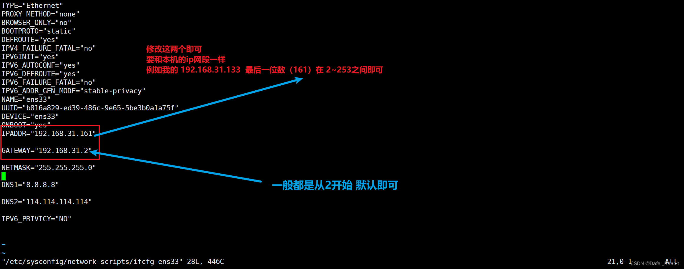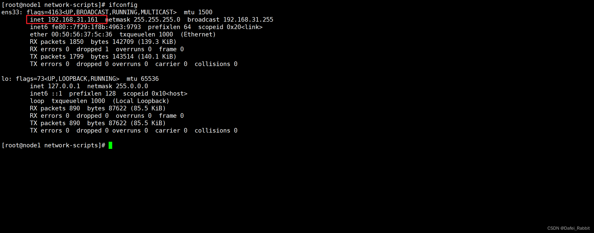 BOOTPROTO="static" DEFROUTE="yes" IPV4_FAILURE_FATAL="no" IPV6INIT="yes" IPV6_AUTOCONF="yes" IPV6_DEFROUTE="yes" IPV6_FAILURE_FATAL="no" IPV6_ADDR_GEN_MODE="stable-privacy" NAME="ens33" UUID="b816a829-ed39-486c-9e65-5be3b0a1a75f" DEVICE="ens33" ONBOOT="yes" IPADDR="192.168.31.161" GATEWAY="192.168.31.2" NETMASK="255.255.255.0" DNS1="8.8.8.8" DNS2="114.114.114.114" IPV6_PRIVICY="NO" # 重启网卡 systemctl restart network # 查看IP地址 ifconfig