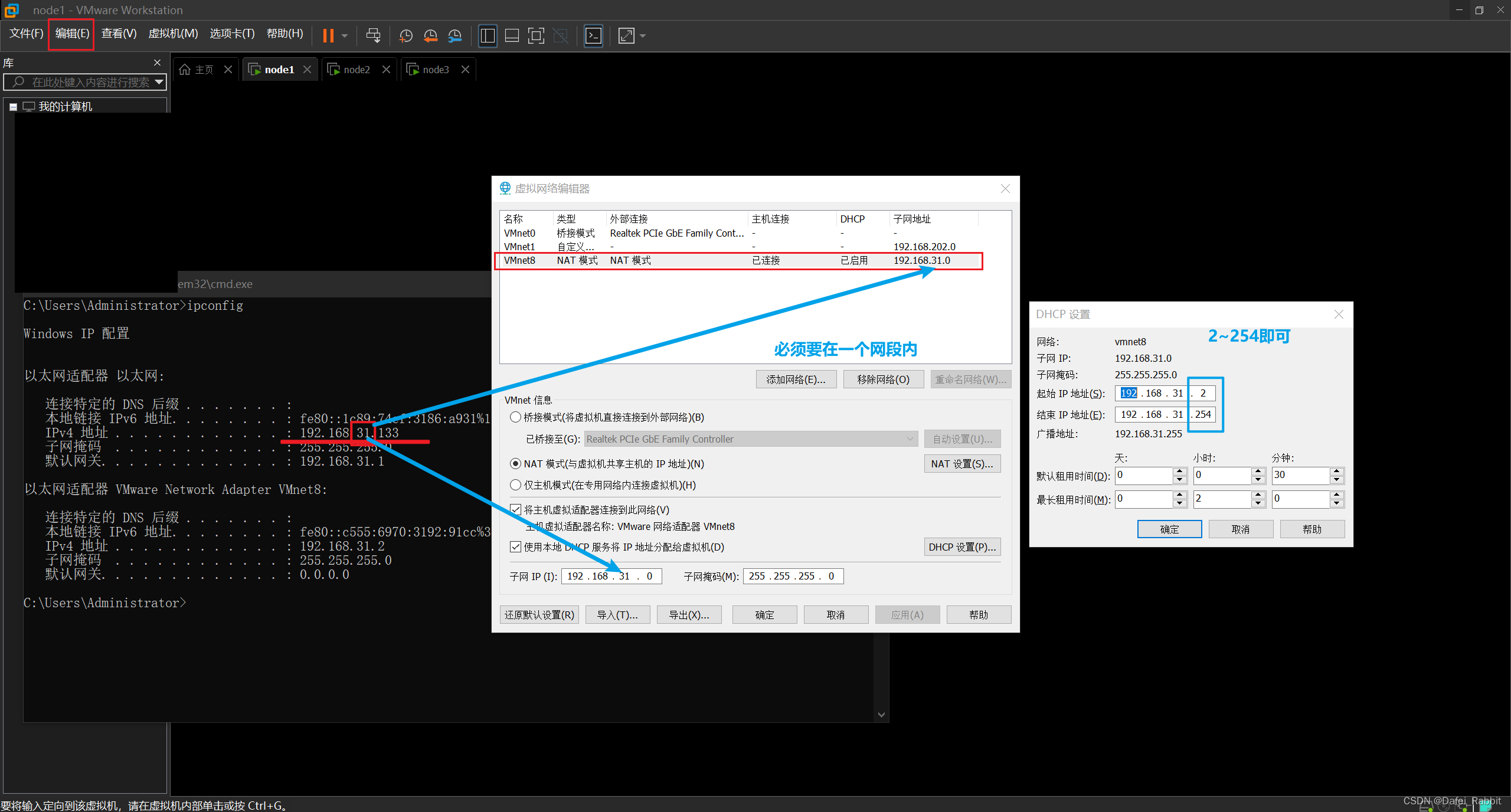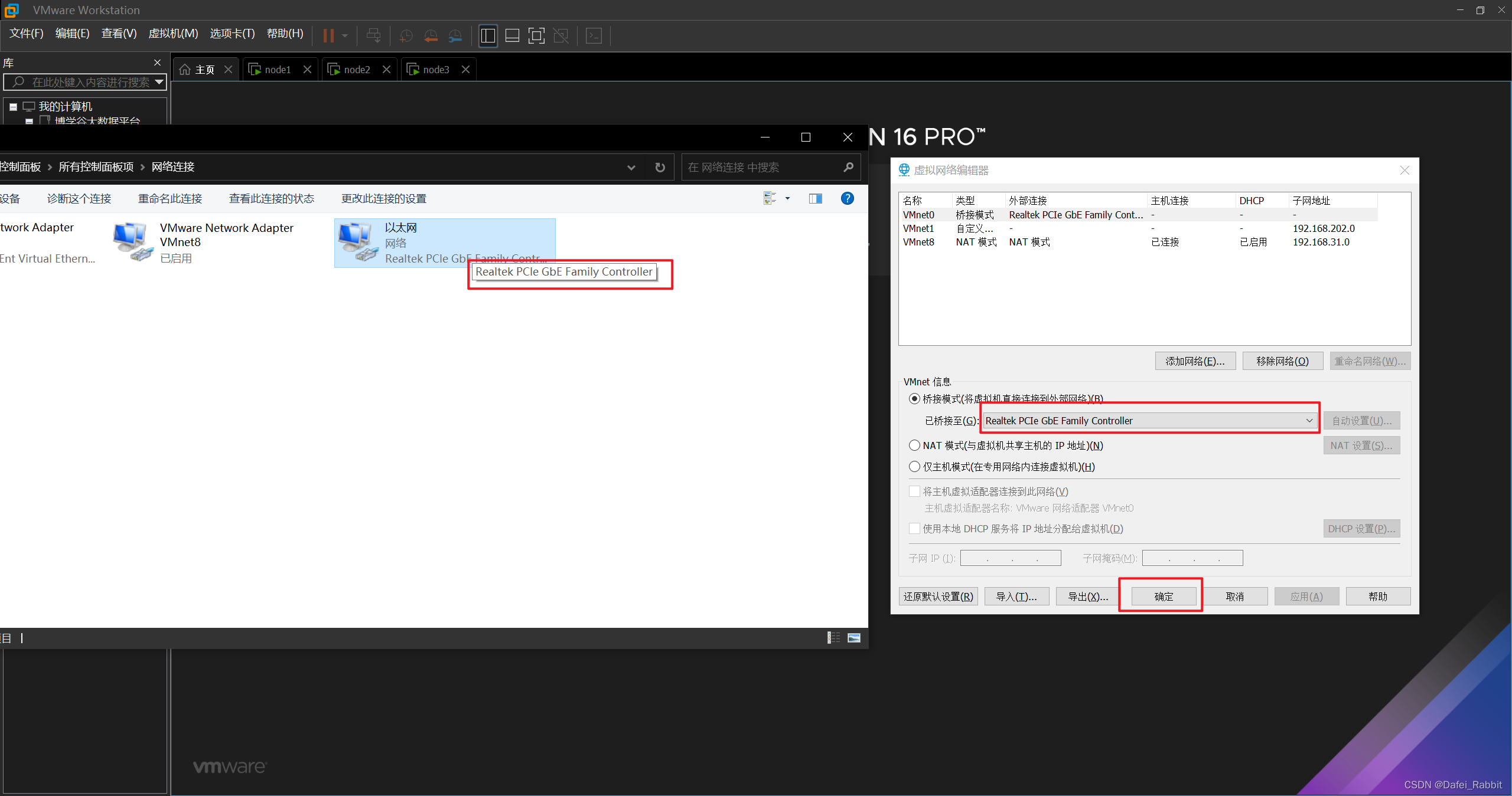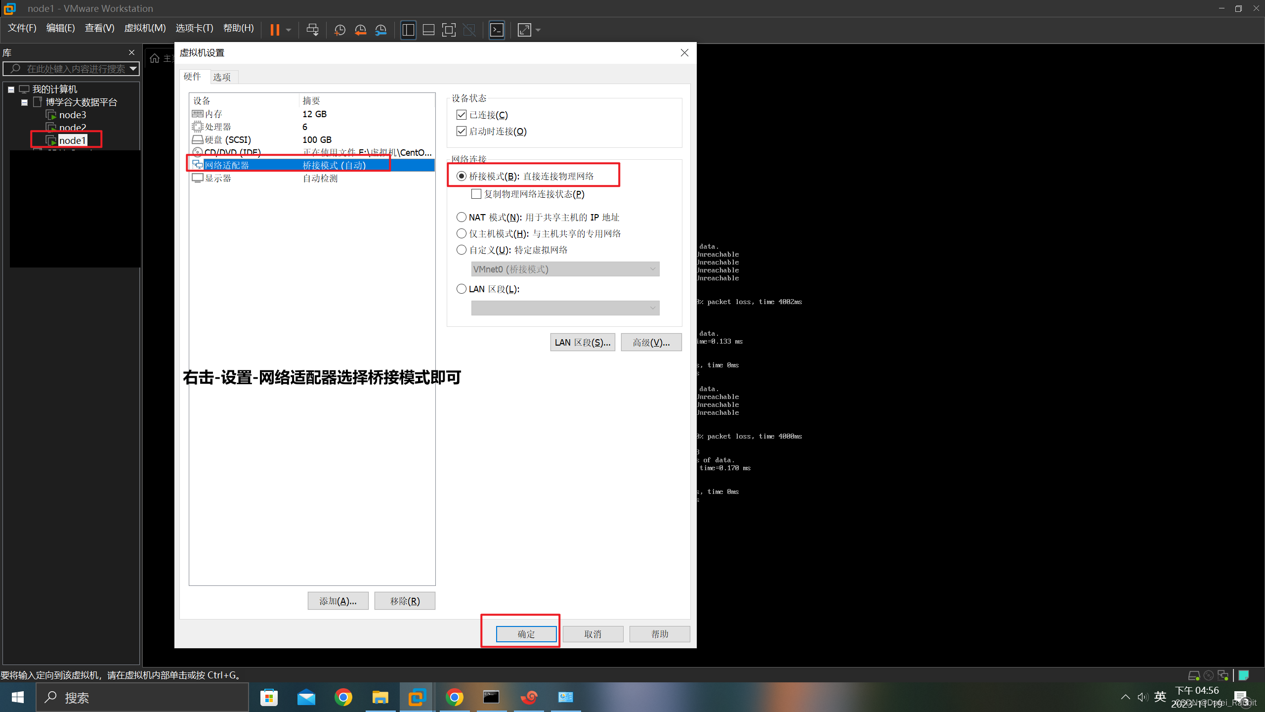 node2、node3 同样的步骤,配置完桥接之后一定要把每个虚拟机都设置一下不然ping不通