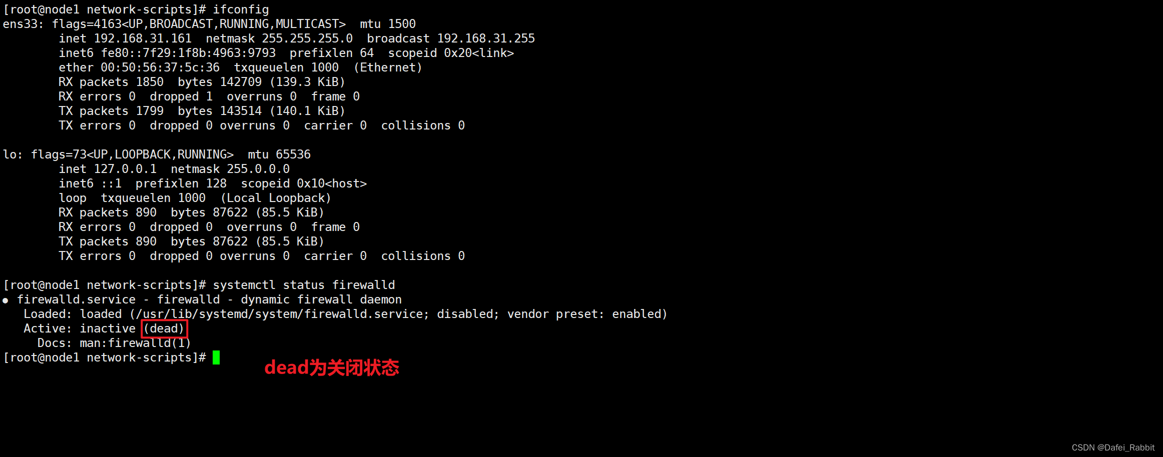 # 查看防火墙状态 systemctl status firewalld # 关闭防火墙 systemctl stop firewalld #禁用防火墙自启动 systemctl disable firewalld