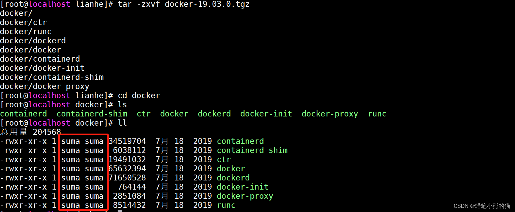 tar -zxvf docker-19.03.0.tgz 查看解压后的文件权限 解压的文件会在当前目录docker文件夹内,这里面也会有个小问题,我不知道是我自己的服务器的问题还是大家都遇到,我解压后的文件权限是suma 而不是root 很奇怪。