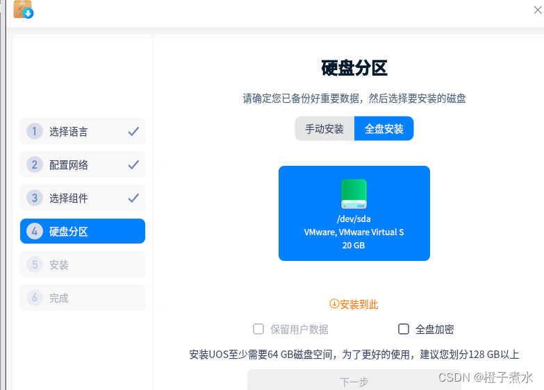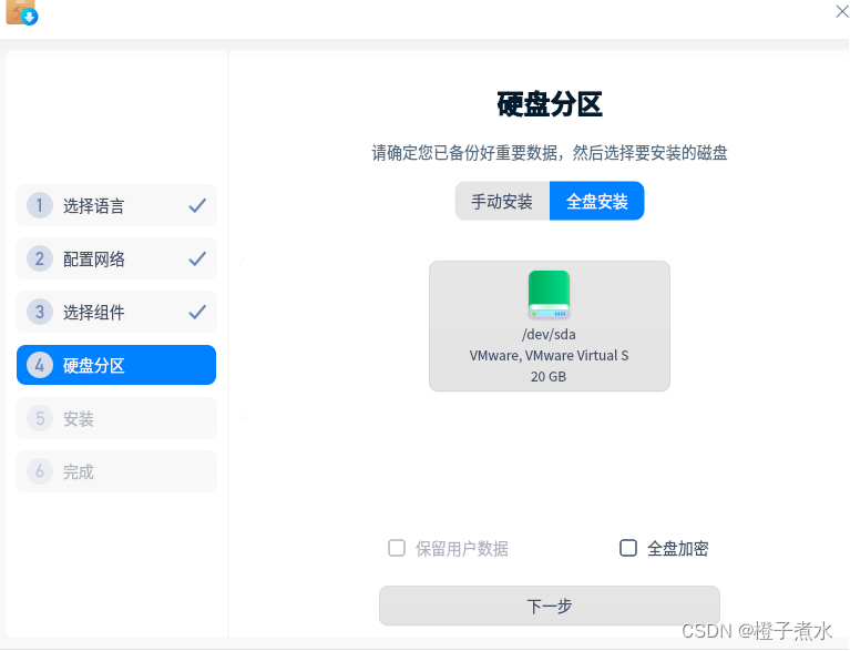 在硬盘分区这个地方,可以选择手动安装或者全盘安装。我懒,因为是做测试,所以选择的是全盘,没有手动。
