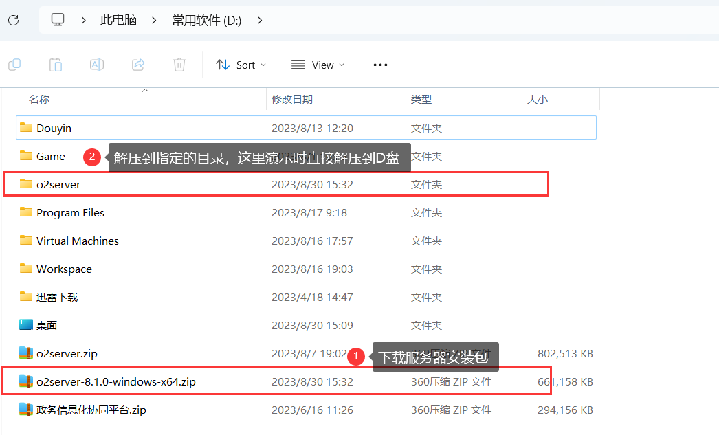 1) 下载o2server_x.x.x_windows.zip程序包(x.x.x为版本号).