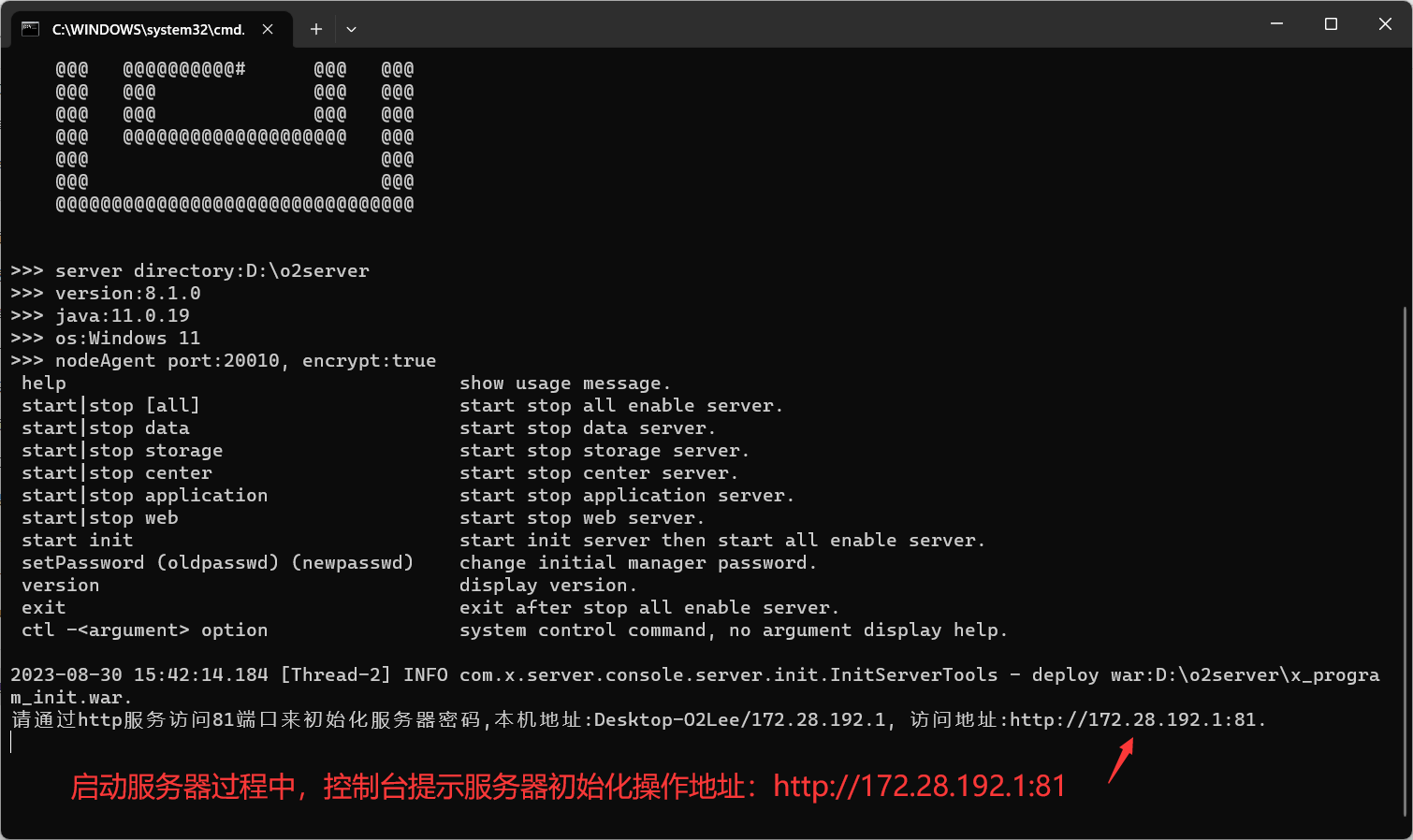 打开o2server文件夹,选择start_windows.bat双击打开(如有必要,请使用管理员身份打开start_windows.bat),命令提示窗口如下图所示: