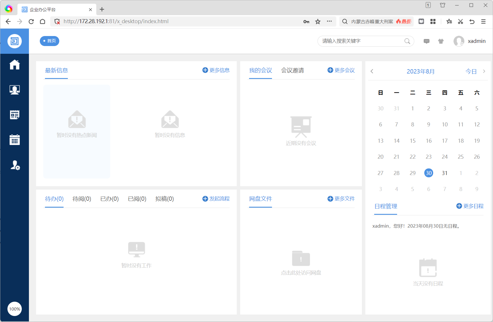 使用管理员账号登录系统(账号:xadmin,密码:自定义的密码),如下图所示: