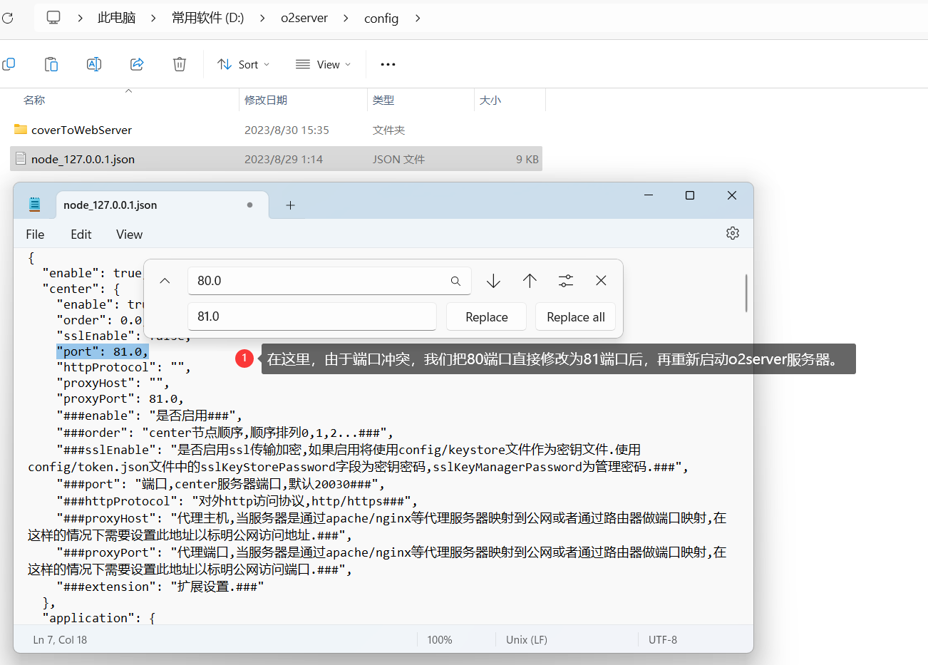 打开o2server/config/node_127.0.0.1.json文件,找到web配置,将端口80修改为其他未占用的端口即可,如下图:
