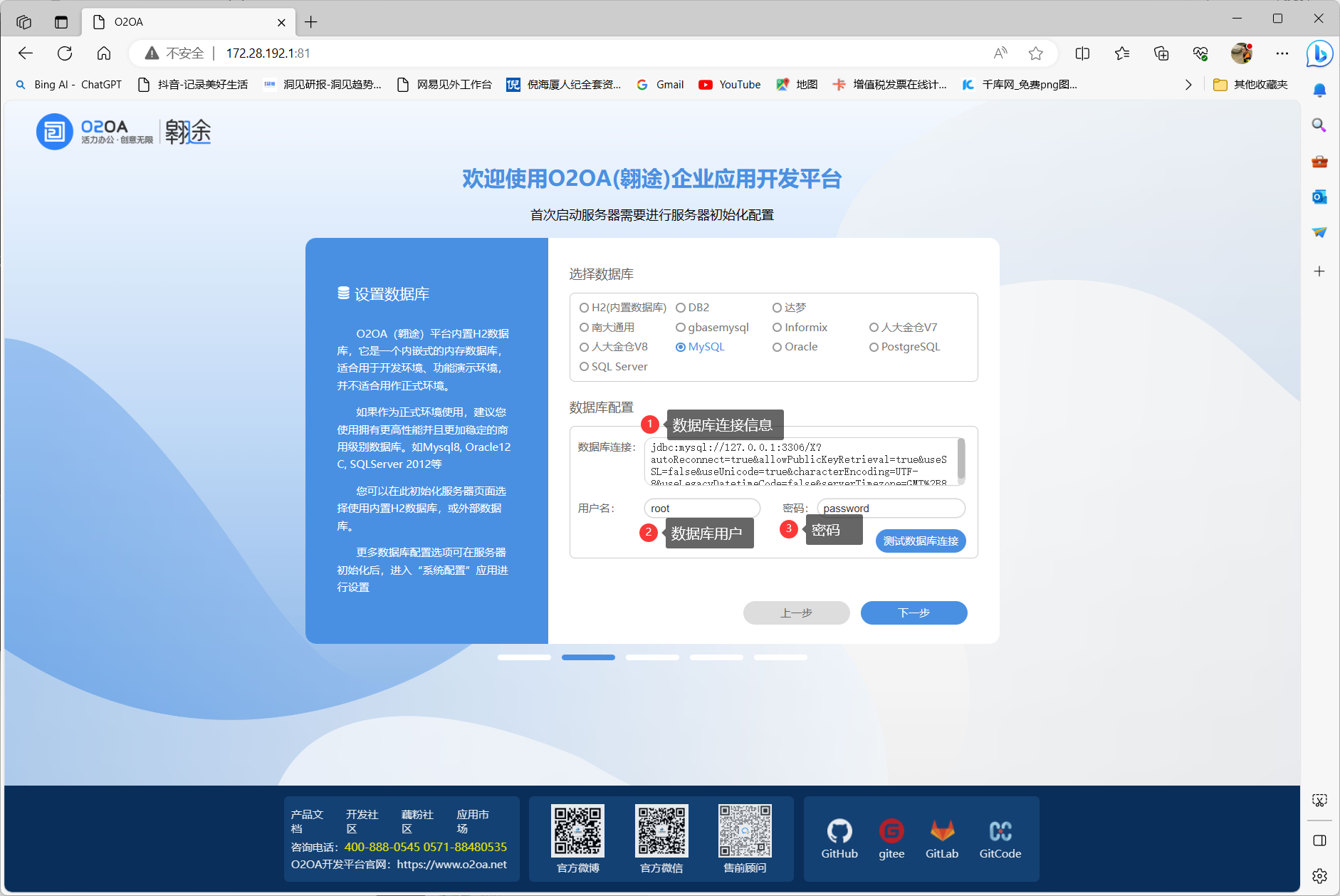 在此界面,可以选择H2内置数据库,也可以使用其他的数据库,O2OA可以支持的数据库有很多,不限于系统所展现出来的这些。