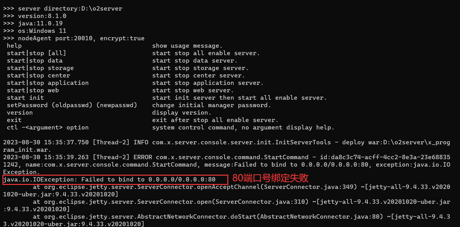 当出现下图错误时,根据O2OA的服务启动顺序,发现20020端口已绑定完成,应该web端口80被占用了。
