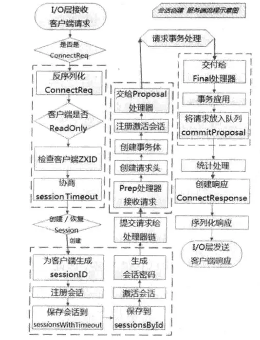 ZK服务端对于会话创建的处理,可以分为请求接收、会话创建、预处理、事务处理、事务应用和会话响应。