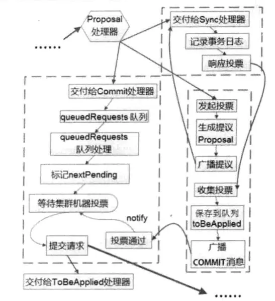 + 等待Proposal投票:Commit流程处理时,Leader根据当前事务请求生成Proposal广播给所有Follower,此时Commit流程需要等待